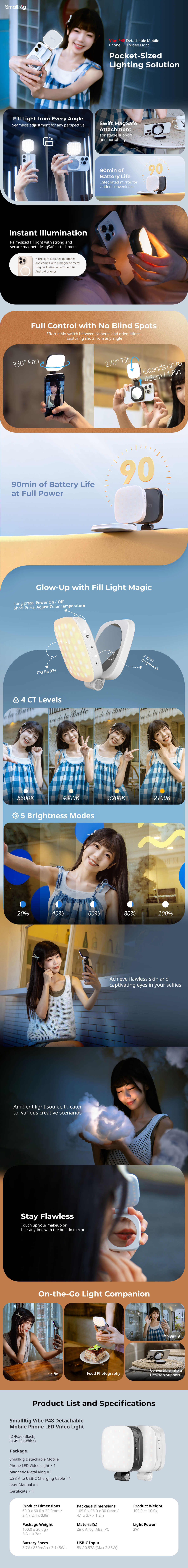 La luz LED de vídeo desmontable SmallRig Vibe P48 para teléfonos móviles (blanca) 4933 es la primera luz de relleno desmontable de SmallRig compatible con MagSafe. Ofrece una conexión y desconexión rápidas y sin complicaciones a los teléfonos Apple a través de MagSafe. También se puede instalar rápidamente en teléfonos Android utilizando la pegatina metálica en forma de anillo incluida.