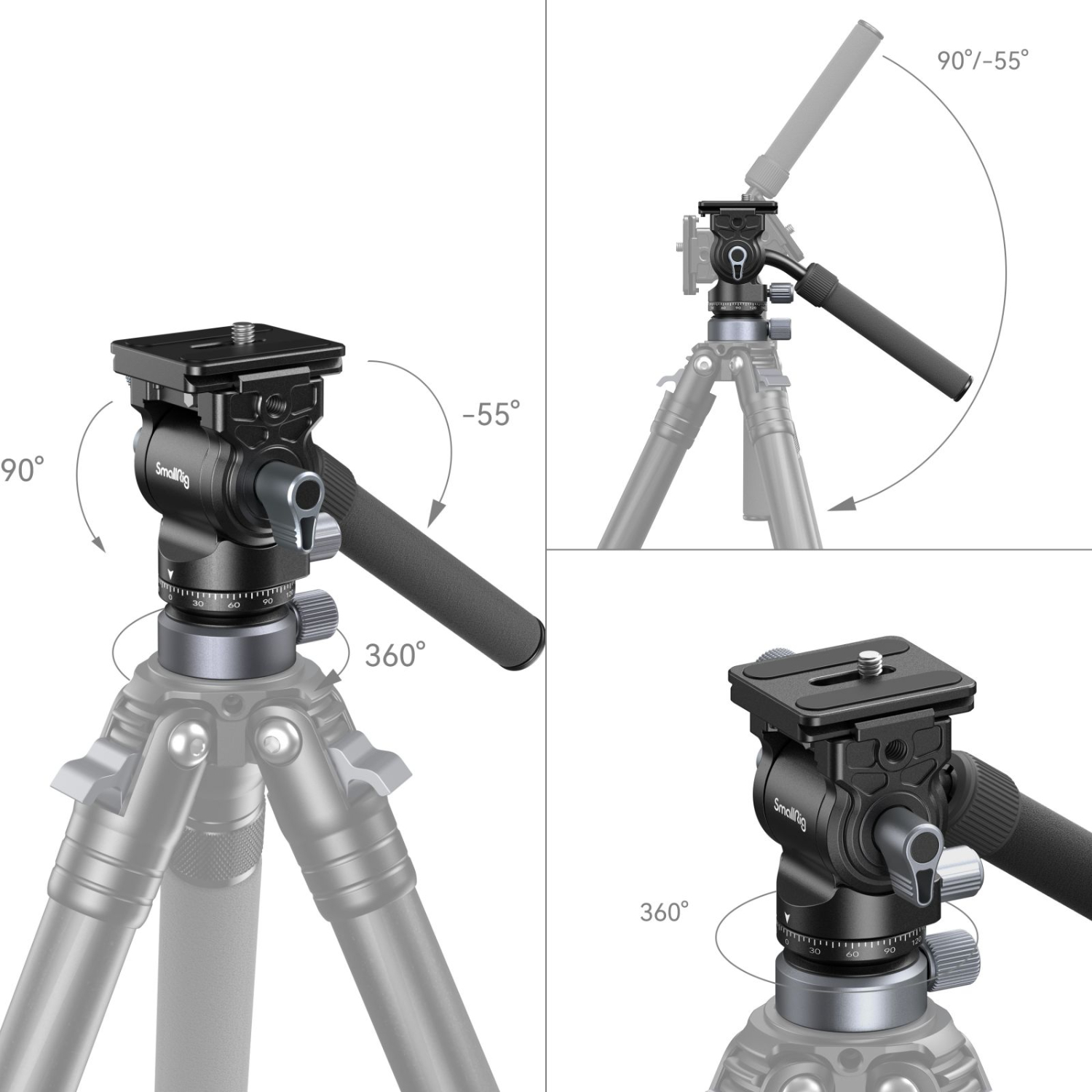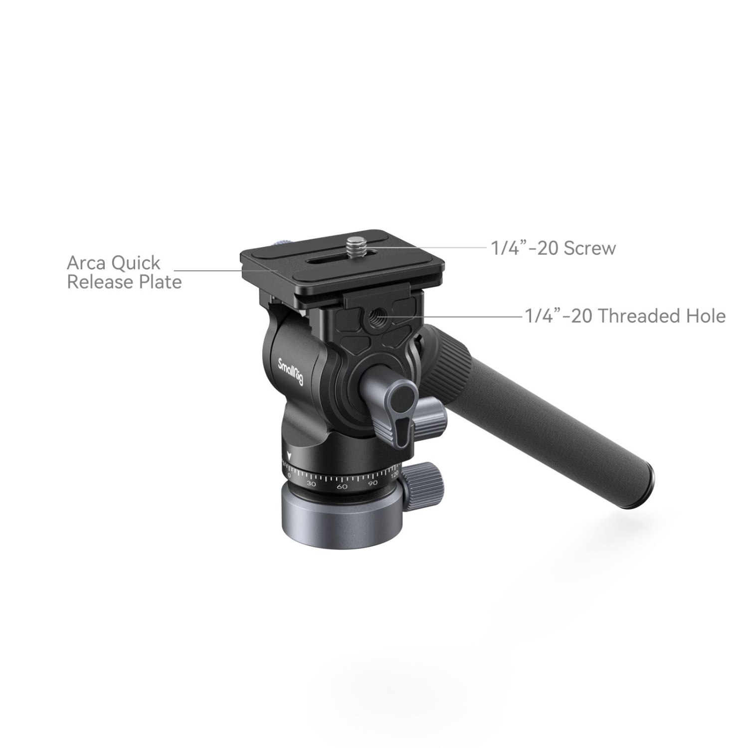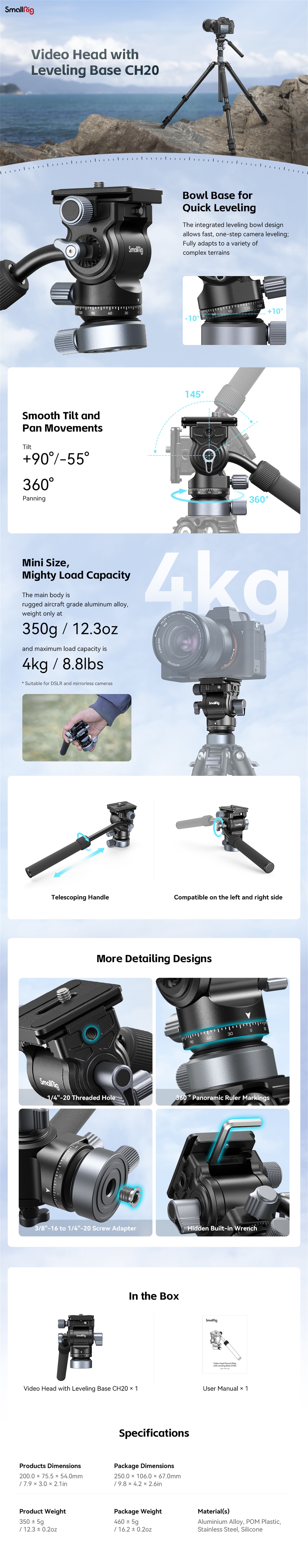 La SmallRig Video Head Mount Plate with Leveling Base CH20 4170B es una rótula fluida compacta y portátil diseñada para la grabación de vídeo. Está equipada con una base de copa integrada que permite un ajuste de 10 / -10° para una rápida nivelación y pesa solo 350 g, con una capacidad de carga de hasta 4 kg. Se puede guardar y transportar fácilmente gracias a su asa telescópica extraíble; el orificio roscado de 1/4"-20 admite accesorios como el brazo mágico. El cabezal también gira 360° y se inclina 90° / -55° para permitir grabar de forma estable desde diferentes ángulos. Además, la llave Allen integrada te ayudará a montar o desmontar la cámara.