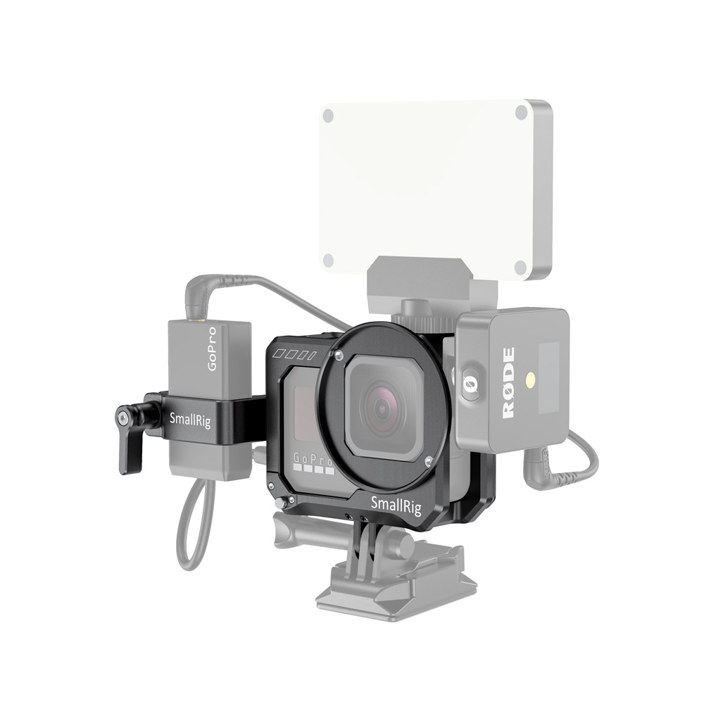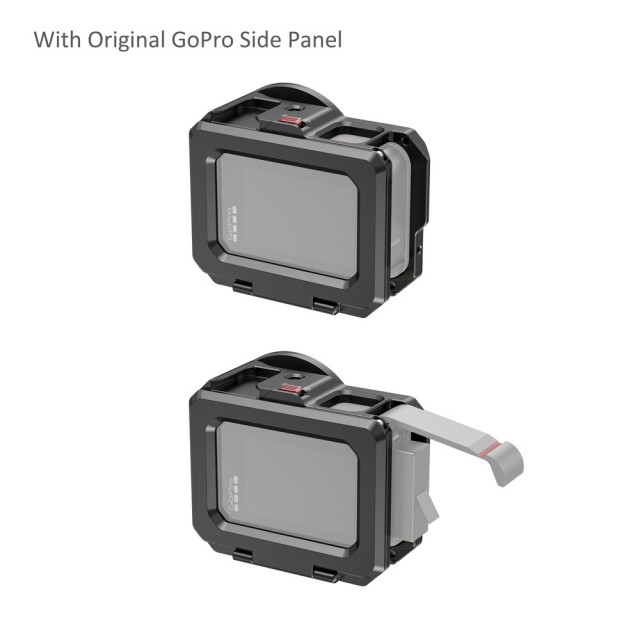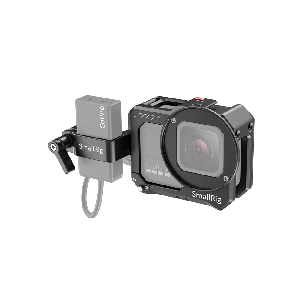 La jaula está equipada con dos zapatas frías y varios orificios de 1/4"-20 para montar accesorios, como un micrófono, una pequeña luz LED, el soporte SmallRig Cold Shoe Mount 1593 o la zapata fría 1960. El soporte para el adaptador de micrófono GoPro se fija al lado derecho de la carcasa mediante los dos tornillos de 1/4"-20 incluidos. Las garras abatibles de la parte inferior permiten fijar la cámara a diversos soportes y superficies GoPro, mientras que el soporte de 1/4"-20 del centro permite fijar la cámara a un trípode de 1/4"-20. El panel lateral es de apertura rápida para cambiar las baterías y puedes cargar la cámara a través del puerto USB-C sin necesidad de abrir el panel. En la parte delantera de la carcasa hay una rosca para filtros que admite filtros con rosca de 52 mm.