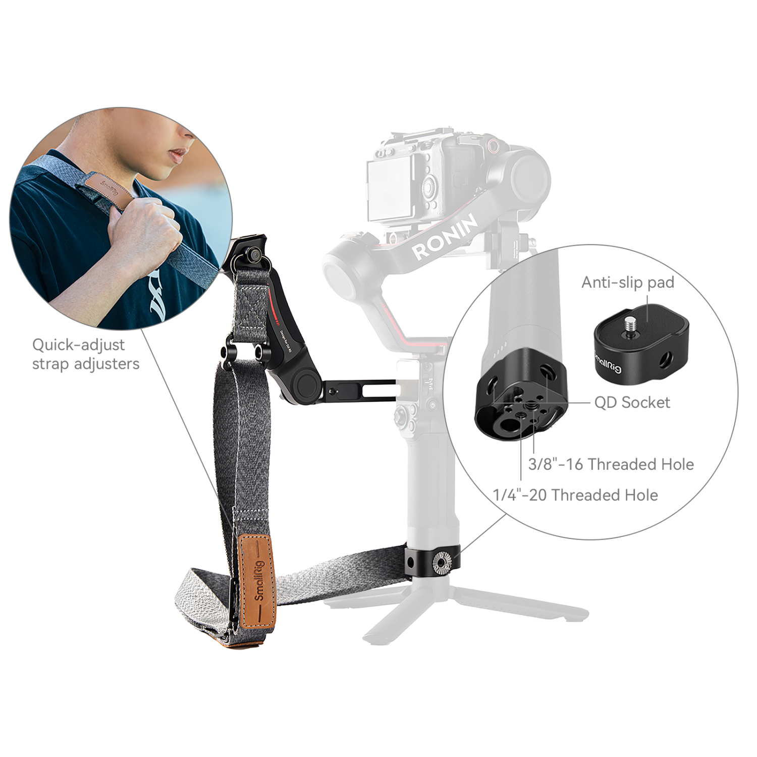 El kit de empuñaduras para reducir el peso SmallRig para DJI RS 3 / RS 3 Pro / RS 2 4383 está diseñado específicamente para los modelos DJI RS 2 / RS 3 / RS 3 Pro. Solo tienes que fijar la placa base a la parte inferior del gimbal DJI con un tornillo de 1/4-20", colgar la correa para el hombro sobre el hombro derecho y, a continuación, extender el trípode del gimbal. Durante la grabación, simplemente levanta el gimbal; en tomas estáticas, puede liberarte de casi todo el esfuerzo de los brazos. Cuando no estés grabando, simplemente suelta el gimbal y cuélgalo en la parte delantera o en el costado como si fuera un bolso de hombro, lo que reducirá en gran medida la carga sobre los brazos. La correa para el hombro está equipada con enganches QD y bisagras giratorias que permiten fijar fácilmente los accesorios y ajustar la longitud. Los orificios roscados de 1/4-20" y 3/8-16" en la placa base permiten fijar trípodes u otros dispositivos. El mango del arpón fija rápidamente el lado izquierdo del gimbal mediante una abrazadera NATO, que cuenta con un diseño antideslizante para mayor seguridad. Los orificios integrados de 1/4"-20 y los orificios de fijación ARRI de 3/8"-16 admiten el brazo Magic Arm 2115C y el soporte para monitor 2903B; las patas de fijación en la parte superior y lateral, así como la barra NATO, admiten el soporte para monitor 3026B, un micrófono, un transmisor de vídeo, etc. Además, el mango se puede inclinar entre 0 y 180 grados mediante un botón de trinquete o funcionar como mango lateral para adaptarse a diferentes necesidades; está fabricado en parte con silicona antideslizante y resistente a las bajas temperaturas y aleación de aluminio, y diseñado ergonómicamente para un agarre cómodo. En general, este kit, fino y compacto, funciona a la perfección con los gimbals.