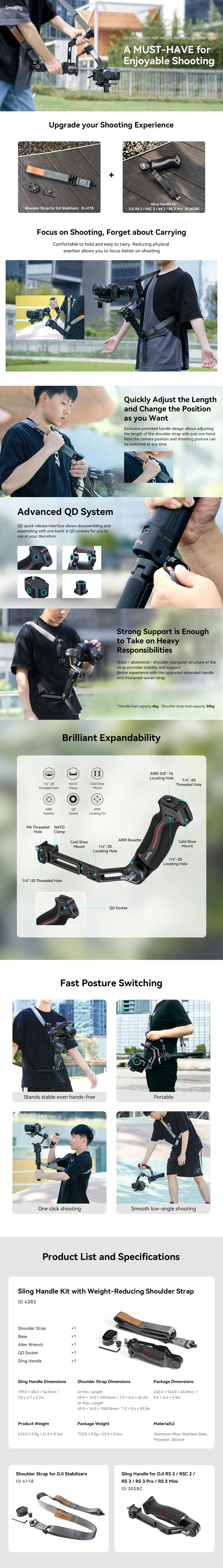 El kit SmallRig Sling Handle con correa de hombro que reduce el peso para DJI RS 2 / RS 3 / RS 3 Pro / RS 4 / RS 4 Pro 4383B está especialmente diseñado para DJI RS 2 / RS 3 / RS 3 Pro / RS 4 / RS 4 Pro. Basta con fijar la placa base a la parte inferior del gimbal DJI mediante un tornillo de 1/4-20", colgar la correa para el hombro sobre el hombro derecho y, a continuación, extender el trípode del gimbal. Durante la grabación, simplemente levante el gimbal; en tomas estáticas, puede liberarle de casi todo el esfuerzo de los brazos. Cuando no estés grabando, simplemente suelta el gimbal y cuélgalo en la parte delantera o en el costado como si fuera un bolso de hombro, lo que reducirá en gran medida la carga sobre los brazos. La correa para el hombro está equipada con enganches QD y bisagras giratorias que permiten fijar fácilmente los accesorios y ajustar la longitud. Los orificios roscados de 1/4-20" y 3/8-16" en la placa base permiten fijar trípodes u otros dispositivos.