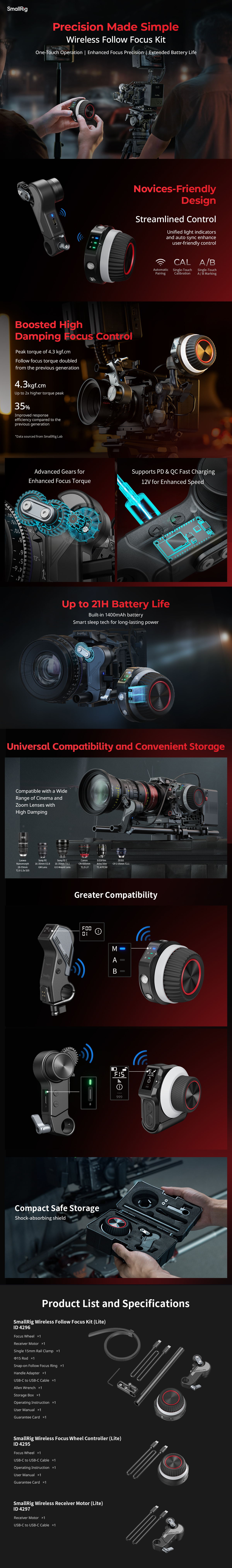 El kit SmallRig Wireless Follow Focus Kit (Lite) 4296B está diseñado para proporcionar un enfoque preciso con baja latencia durante la grabación de vídeo. El kit está equipado con indicadores luminosos rojos y azules para indicar el estado de la conexión y los canales (luz azul: F00-1; luz verde: F15-1) y ofrece instrucciones intuitivas y fáciles de usar para…