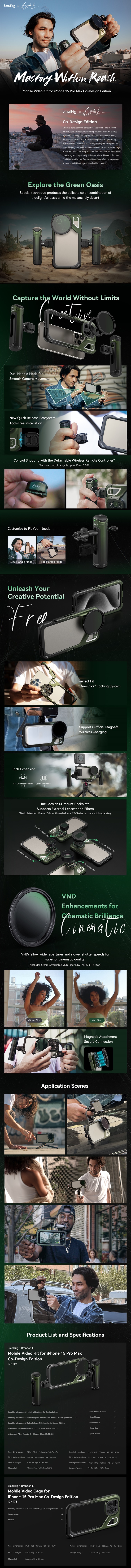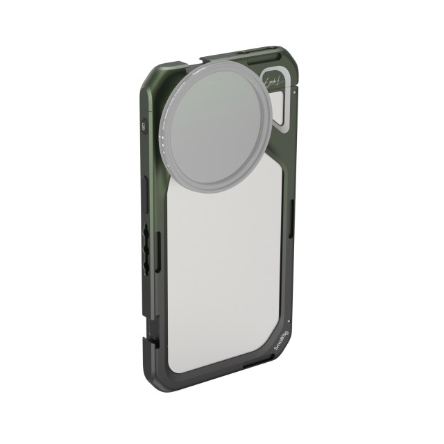 La jaula de vídeo móvil SmallRig x Brandon Li para iPhone 15 Pro Max Co-design Edition 4473 es una jaula multifuncional para iPhone diseñada específicamente para el iPhone 15 Pro Max, que permite realizar grabaciones de vídeo de alta calidad, retransmisiones en directo y grabaciones de vlogs. Esta jaula compacta pesa tan solo 85 g. Está equipada con orificios roscados de 1/4"-20 y zapatas para fijar un mango, un trípode, un micrófono, una luz LED de vídeo, etc., lo que facilita y agiliza un ecosistema de fijación rápida totalmente nuevo. En ambos lados hay orificios para correas de menos de 2 mm de diámetro. Permite acoplar un objetivo con montura M o, tras cambiar la placa trasera del objetivo con rosca de 17 mm / 37 mm, un objetivo de la serie T de Moment. Está ligeramente ahuecada para garantizar un acceso completo a todos los botones, puertos, al objetivo ultra gran angular con radar y al cargador inalámbrico MagSafe. Su diseño fácil de usar, con cierre y liberación rápidos, es más seguro y estable, y evita el desbloqueo accidental por un toque involuntario. La carcasa metálica maciza también cuenta con almohadillas integradas que evitan posibles golpes y arañazos. El uso de esta carcasa no afecta en absoluto a la posibilidad de tomar fotografías horizontales o verticales.
