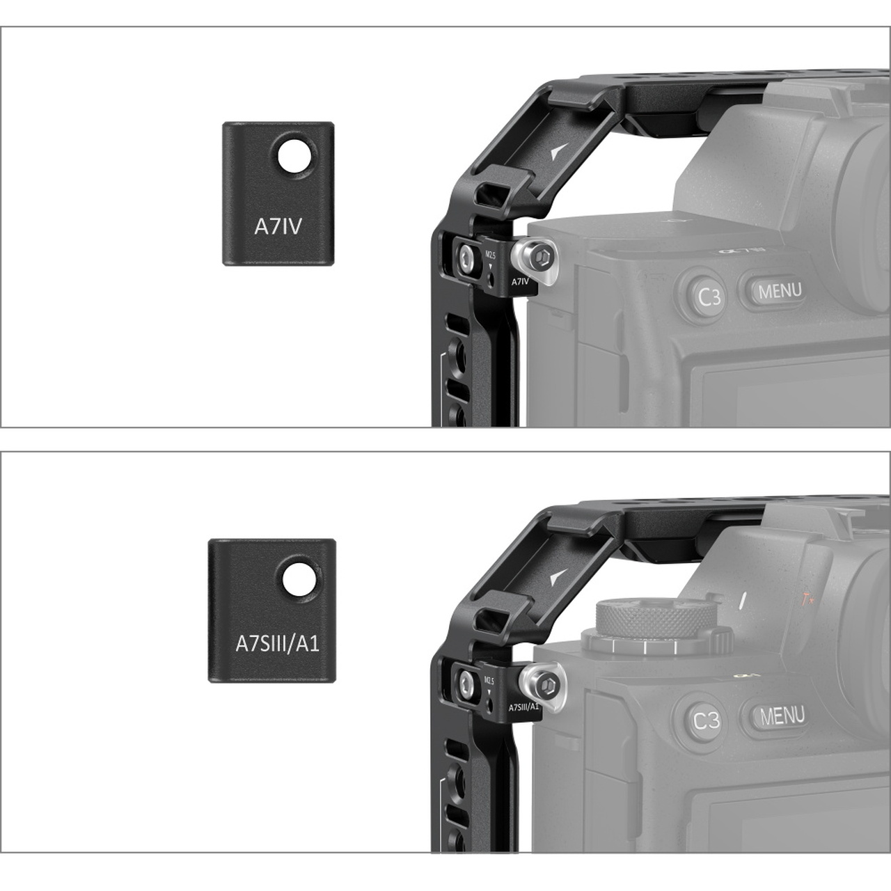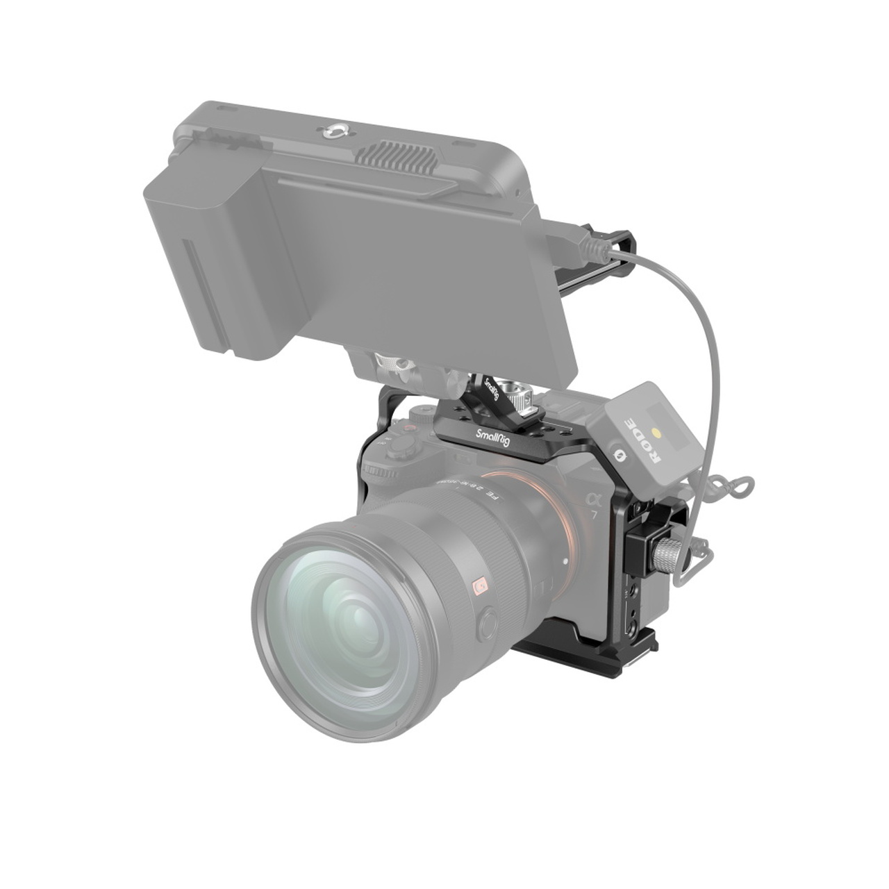 El kit básico SmallRig para Sony Alpha 7 V /7R V/7R IV/ IV/ 7S III 3668 está diseñado para facilitar la fotografía desde ángulos bajos y proteger la cámara, al tiempo que ofrece una amplia gama de puntos de fijación para accesorios. Incluye una jaula, una abrazadera para el cable HDMI y una empuñadura superior. La empuñadura superior es cómoda y facilita el transporte incluso al fotografiar desde un ángulo bajo. Los orificios roscados de 1/4"-20, los orificios de posicionamiento ARRI de 3/8"-16, las zapatas frías y los rieles NATO admiten el soporte para monitor2294, micrófonos, luces LED, el soporte para monitor 2903 y accesorios NATO. La abrazadera para cables HDMI, montada en el lado izquierdo de la jaula mediante un tornillo de 1/4"-20 y dos pasadores de posicionamiento, evita el desplazamiento y sujeta los cables, protege la interfaz y garantiza la estabilidad de la transmisión de la señal. Además, los orificios a ambos lados de la jaula permiten fijar correas para las manos. La jaula se suministra con un destornillador magnético plano integrado y una llave hexagonal para facilitar el desmontaje y el montaje.