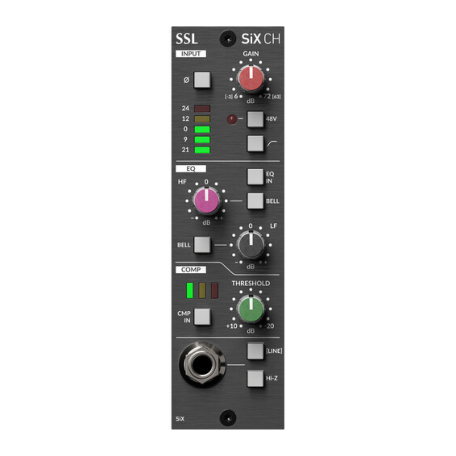 El SiX CH es un canal de una banda de la serie 500 que utiliza las funciones de procesamiento de canales SuperAnalogue de la consola SSL SiX, incluyendo un preamplificador de micrófono, un ecualizador de graves y agudos y un compresor de una banda.