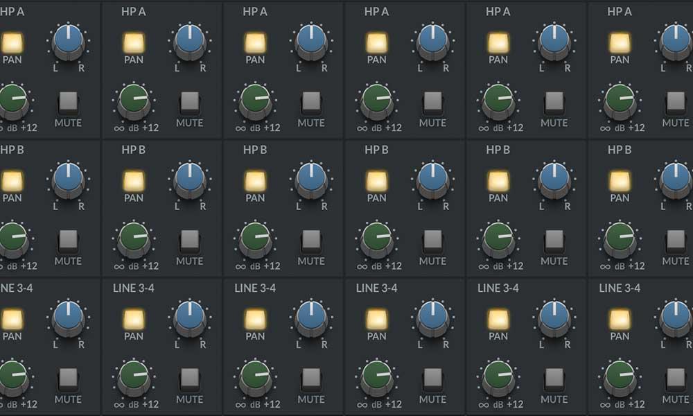 El SSL 12 ofrece un mezclador intuitivo al estilo de una mesa de mezclas virtual para seleccionar mezclas de auriculares. Gracias al control independiente de panorámica, nivel y atenuación disponible para cada envío, tendrás el mezclador SSL 12 totalmente bajo tu control.