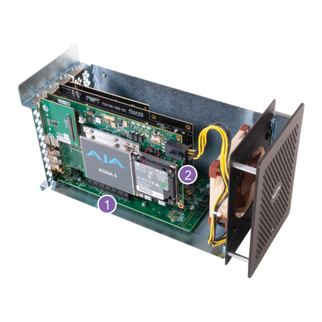 La echo Express SE IIIe incluye un conector de alimentación PCIe adicional que te permite instalar tarjetas que requieren alimentación adicional, como la AJA® Kona® 5 o la Blackmagic DeckLink 4K Extreme 12G, así como las tarjetas Epoch y KRONOS SDI de Bluefish444.