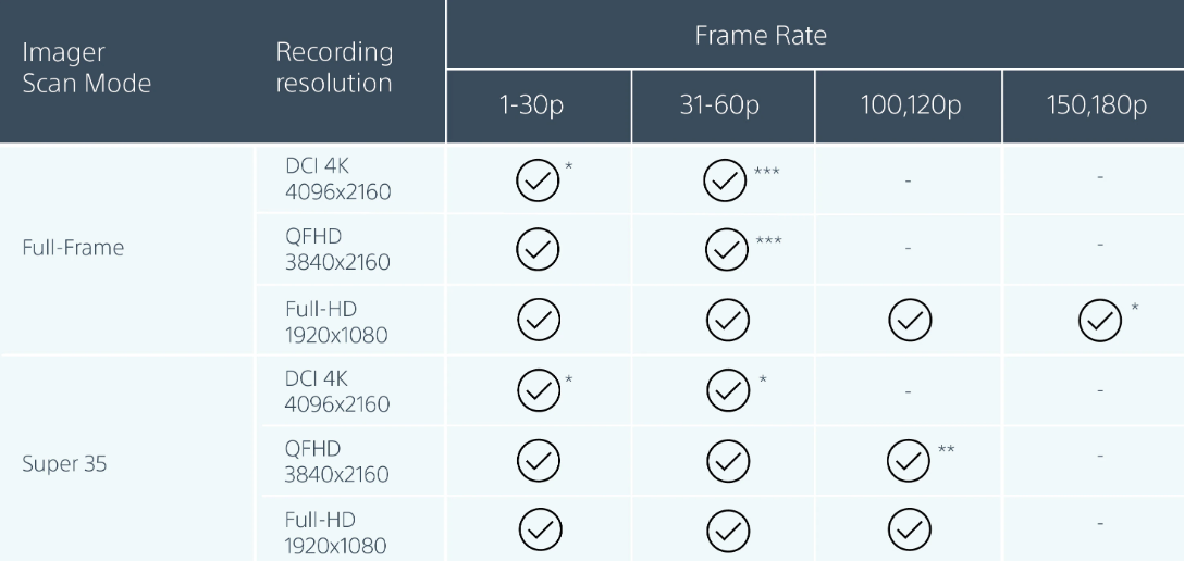 Modo XAVC-I QFHD: 3840 x 2160/59,94P, 50P, 29,97P, 23,98P, 25P