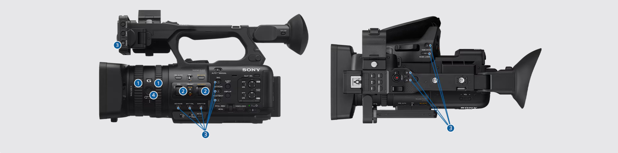La cámara Z200 está diseñada teniendo en cuenta la flexibilidad de control según sus preferencias individuales y requisitos de flujo de trabajo. Dos anillos de control independientes para el enfoque/zoom [1]* y dos selectores para IRIS/ND Variable [2] están situados uno al lado del otro, lo que permite un control fluido de la exposición junto con el enfoque y el zoom. La cámara Z200 también cuenta con 12 botones asignables por el usuario (ASSIGN 1-11 [3] y el botón FOCUS PUSH AUTO [4]), que puedes configurar para controlar casi cualquier función de la cámara