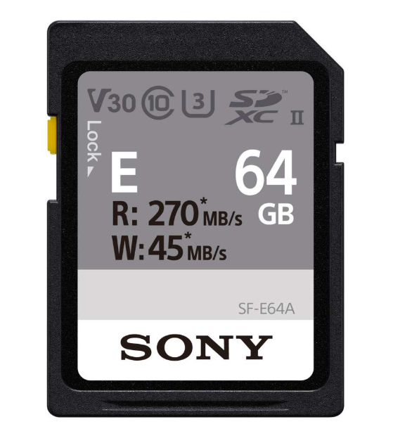 La tarjeta de memoria Sony SDXC de 64 GB de la serie SF-E con UHS-II ofrece un rendimiento rápido para fotografía y vídeo, y es compatible con la grabación en 4K, el disparo continuo y una transferencia de datos fiable a alta velocidad.
