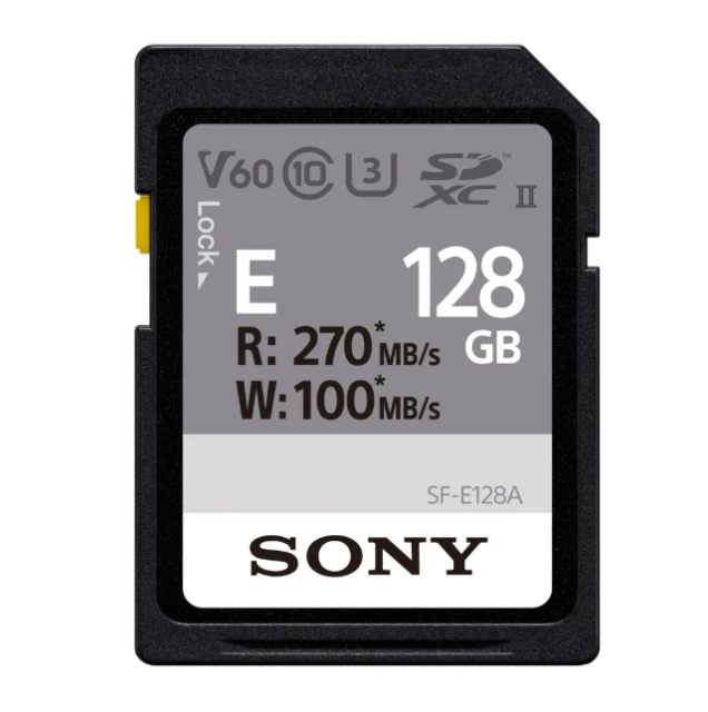 La tarjeta de memoria Sony SDXC SF-E de 128 GB UHS-II es una solución de almacenamiento de alto rendimiento diseñada para fotógrafos y videógrafos. Con velocidades de lectura de hasta 270 MB/s y de escritura de hasta 100 MB/s, es compatible con el disparo continuo, la captura de imágenes RAW y la grabación de vídeo en alta resolución, incluido el 4K.