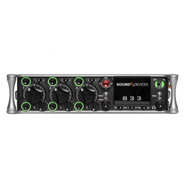 El modelo 833 cuenta con 6 preamplificadores de micrófono/línea, 8 canales, 12 pistas, 6 salidas analógicas y un generador de código de tiempo de gran precisión. También ofrece una serie de funciones heredadas del modelo más alto de Sound Devices, el Scorpio, incluyendo nuevos circuitos de preamplificadores, 2 ranuras para tarjetas SD, dos ranuras para baterías L-Mount y un disco SSD interno de 256 GB. Además, utiliza la misma arquitectura FPGA para el procesamiento de datos que el Scorpio, incluyendo el enrutamiento flexible de la señal: las entradas físicas se pueden asignar a cualquier pista.
