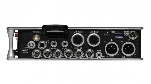 Grabador portátil con 16 preamplificadores de micrófono/línea, 32 canales de entrada/salida DANTE, hasta 36 pistas de grabación, entradas y salidas AES, 12 salidas analógicas, limitadores analógicos, filtros de paso alto, grabación en SSD y 2 tarjetas CD, generador de código de tiempo preciso, alimentación mediante 2 baterías L-Mount o fuente de alimentación externa a través de conector TA4, adaptador incluido.