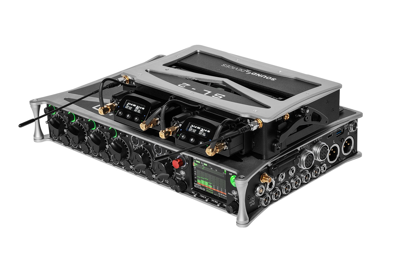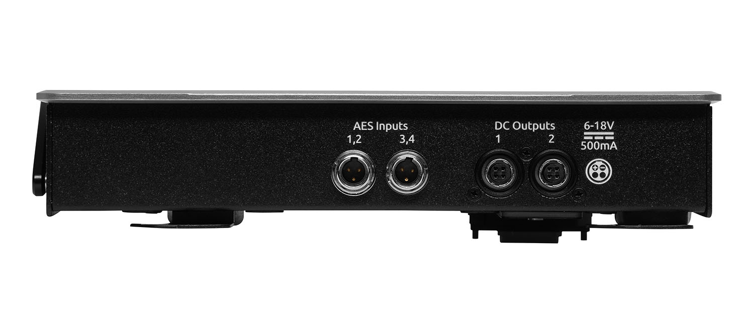 El grabador suministra alimentación tanto al SL-2 como a los receptores, por lo que no es necesario utilizar una fuente de alimentación externa adicional, y el puerto de expansión también admite la transmisión directa de audio analógico y digital. El panel trasero ofrece además un par de conectores TA-3 (cuatro entradas AES3 adicionales) y dos salidas de alimentación Hirose de 4 pines (cada una de 500 mA máx.) para alimentar otros dispositivos.Estos dispositivos deben actualizarse al menos a la versión FW 6.00.