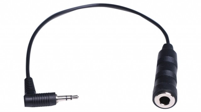 Cable alargador/adaptador para auriculares con conector jack de 3,5 mm macho a 90° y conector jack de 6,3 mm hembra.