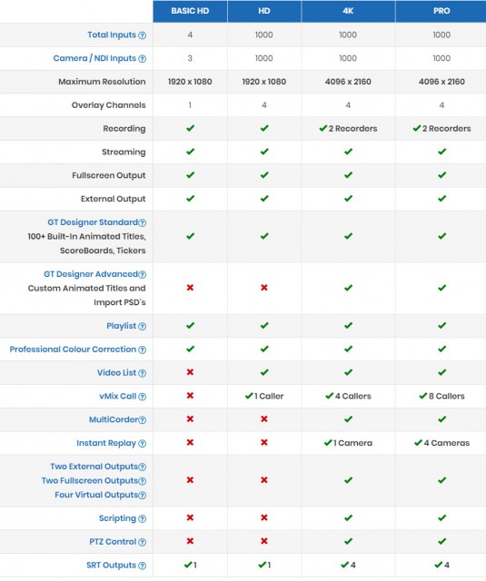 La versión del software vMix PROtiene todas las características devMix 4K, pero además incluye: