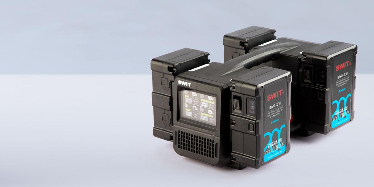 En el cargador SWIT PC-P461B B-mount se pueden cargar 4 baterías BIVO-200 simultáneamente, con una carga ultrarrápida de 33,6 V, 3 A y 100 W. El cargador tarda aproximadamente 3 horas en cargar completamente 4 baterías BIVO-200.