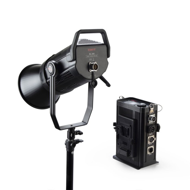 El BL-200 separa la caja de control del cabezal de la luz, lo que permite el funcionamiento con baterías para la iluminación exterior. La caja de control cuenta con una entrada de CA PowerCON, 2 placas de batería V-mount, un conector de CC con el cabezal de la luz, entradas y salidas DMX de 5 pines, botones de control y pantalla LCD.