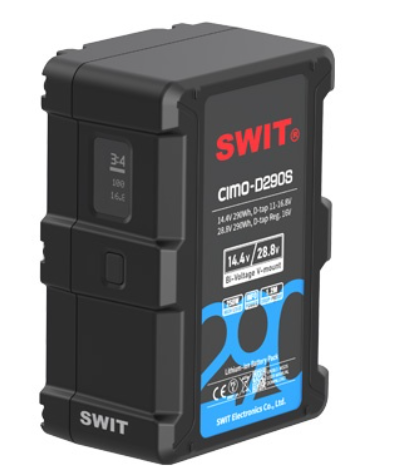 La SWIT CIMO-D290S es una batería profesional de 290 Wh con doble voltaje y pantalla OLED, que admite salidas de 14,4 V y 28,8 V para cámaras de cine y equipos de iluminación de alto rendimiento, con carga rápida, salidas D-tap duales y varios circuitos de protección.