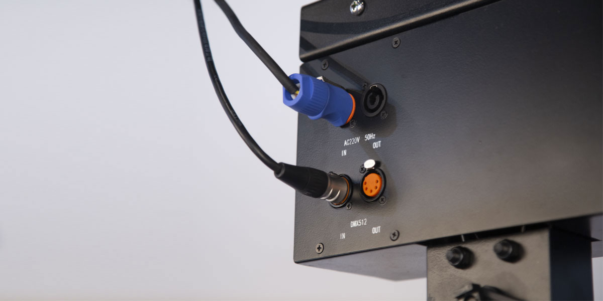 En el panel frontal se puede configurar la dirección DMX para controlar el pantógrafo hacia arriba y hacia abajo.