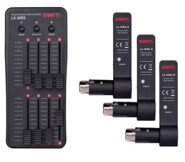 El kit SWIT LA-WR8 Tx+3Rx es un controlador DMX inalámbrico de bolsillo que incluye 1 transmisor y 3 receptores, y ofrece control inalámbrico de 2,4 GHz con un alcance de hasta 400 m (línea de visión). Es compatible con todas las luces DMX512 estándar, elimina el complicado cableado y permite un control rápido de la iluminación de tipo «plug-and-play» tanto para producciones sobre el terreno como en estudio.