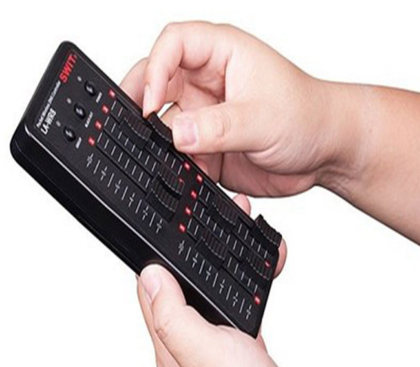 Gracias a la transmisión inalámbrica de 2,4 GHz, el sistema garantiza un emparejamiento rápido, una gran resistencia a las interferencias y una distancia de transmisión de hasta 400 metros en línea recta. La unidad de control es compatible con el protocolo estándar DMX512 y está equipada con 8 faders con 7 conmutadores de grupo (un total de 56 canales DMX), que están marcados con LED de grupo de 7 colores para facilitar la identificación y la sincronización con los receptores.