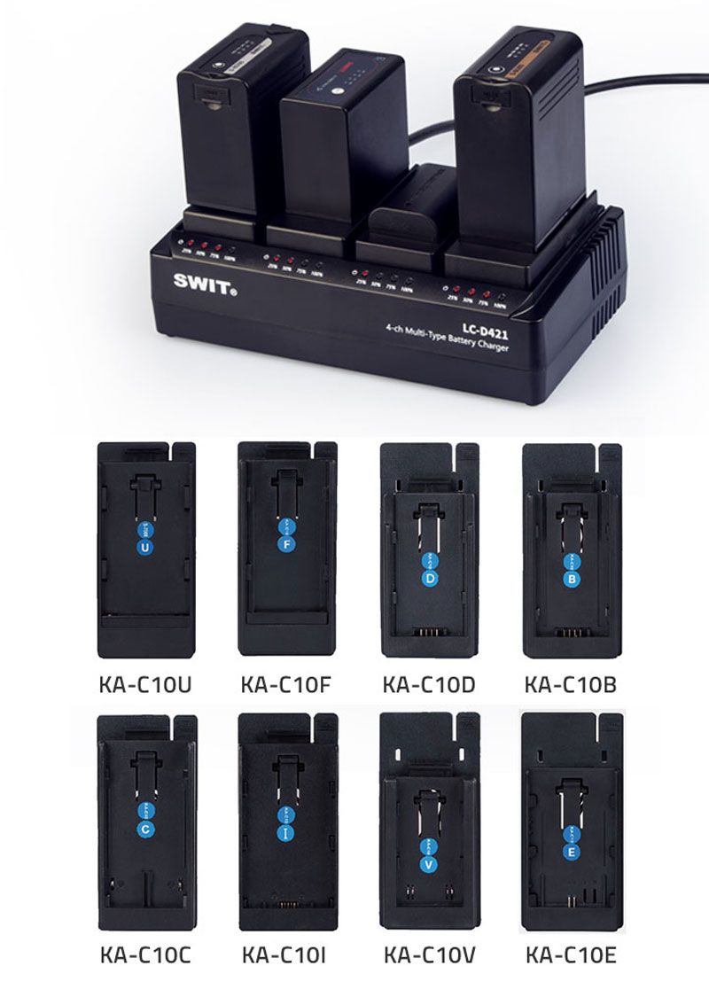 Cargador SWIT LC-D421 de 4 canales con bandejas para baterías intercambiables. El cargador LC-D421 incluye el cargador propiamente dicho (sin placas), al que se le pueden acoplar hasta 4 placas de batería diferentes para cámaras Sony, Panasonic, JVC o Canon. Una solución económica si tienes varias baterías y dispositivos diferentes: un solo cargador para casi todas las baterías y dispositivos.