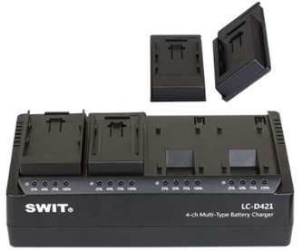 El SWIT LC-D421U KIT es un cargador de 4 canales para baterías DV que se suministra con cuatro placas de carga tipo Sony BP-U, lo que permite cargar de forma simultánea y eficaz hasta cuatro baterías DV con la flexibilidad que ofrecen las placas intercambiables.