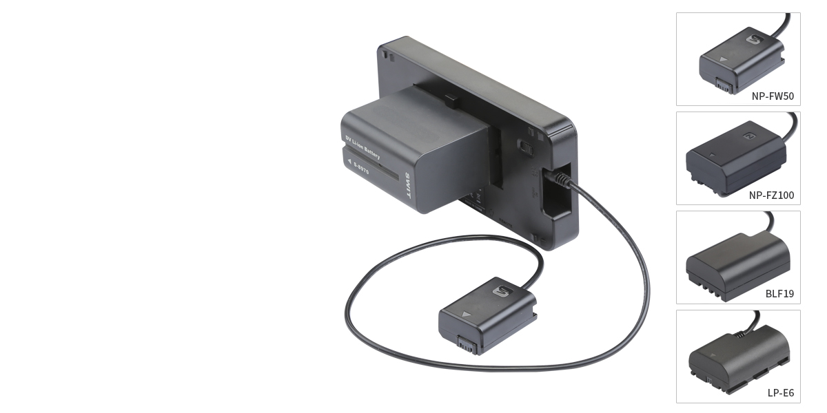 El SWIT MA-55C2 es un adaptador de batería ficticia Sony NP-FZ100 para el monitor HDMI 4K SWIT CM-55C y está diseñado para alimentar dispositivos externos desde el monitor, por ejemplo, para la Sony ?7III, ?7RIII o ?9. Si el monitor se alimenta con batería, la toma BATT OUT puede alimentar cámaras desde una fuente de alimentación de batería de CC mediante adaptadores de batería ficticia.