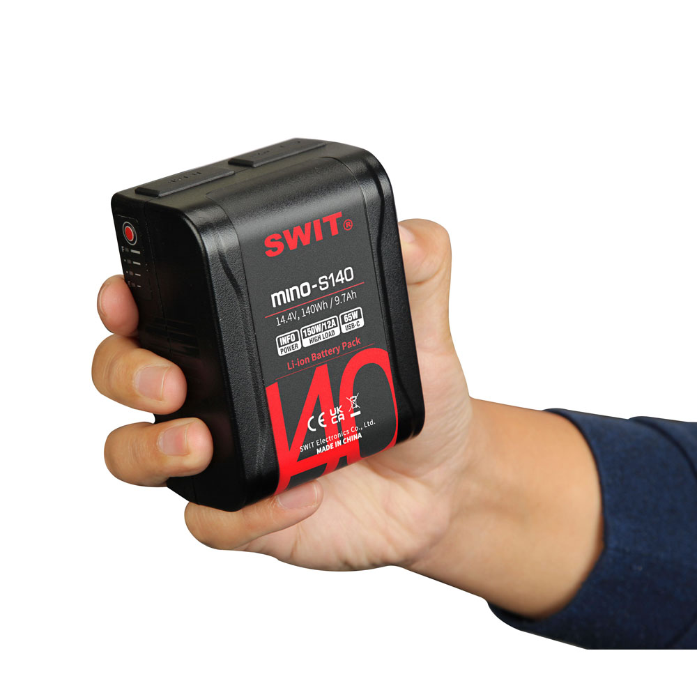 En comparación con la popular batería de bolsillo SWIT de 98 Wh con montura en V, la nueva batería MINO-S140 tiene un 43 % más de capacidad, pero sigue teniendo unas dimensiones reducidas para un transporte cómodo.