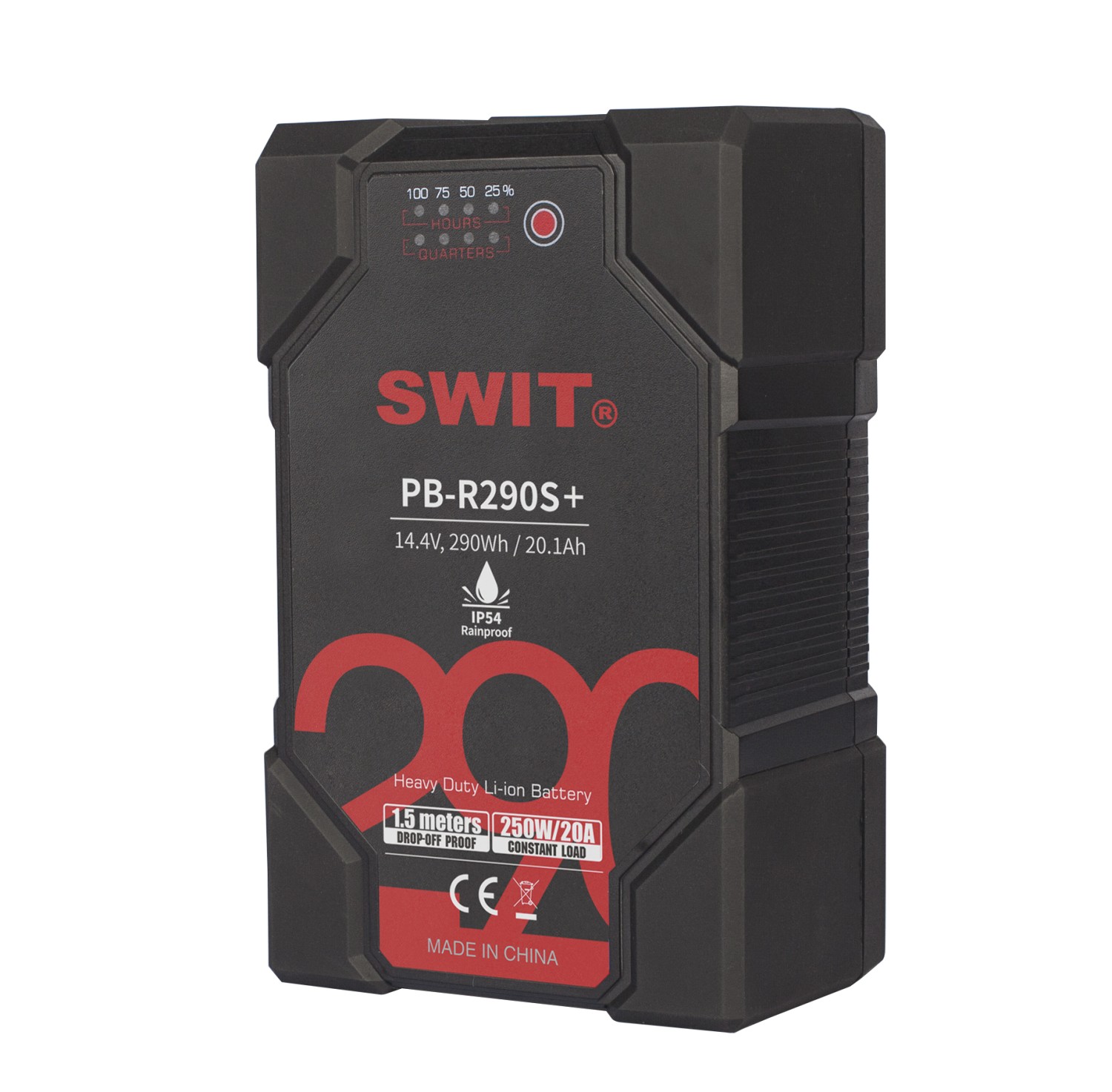 La PB-R290S+ es una batería de 290 Wh para montaje en V, destinada a cámaras Cine y ENG, con carcasa de doble sellado, resistente a la lluvia según la norma IP54 y a caídas desde una altura de 1,5 m. La batería admite cargas elevadas, carga rápida y visualización digital de la información de alimentación, para su uso sobre el terreno.