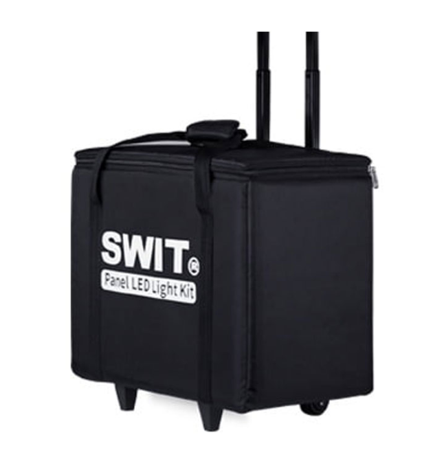 El Swit PL-E90L 3Case es un resistente carro de transporte diseñado para transportar y proteger hasta tres luces LED PL-E90L. Está equipado con ruedas y un asa extensible, lo que permite transportar cómodamente equipos de iluminación profesionales.