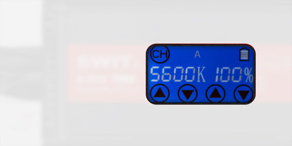 La caja de control del S-2610 está equipada con un panel LCD en el que se muestran el valor del regulador de intensidad, el valor de la temperatura de color, el estado de la batería y el canal inalámbrico. Para el control se utilizan botones táctiles arriba/abajo.