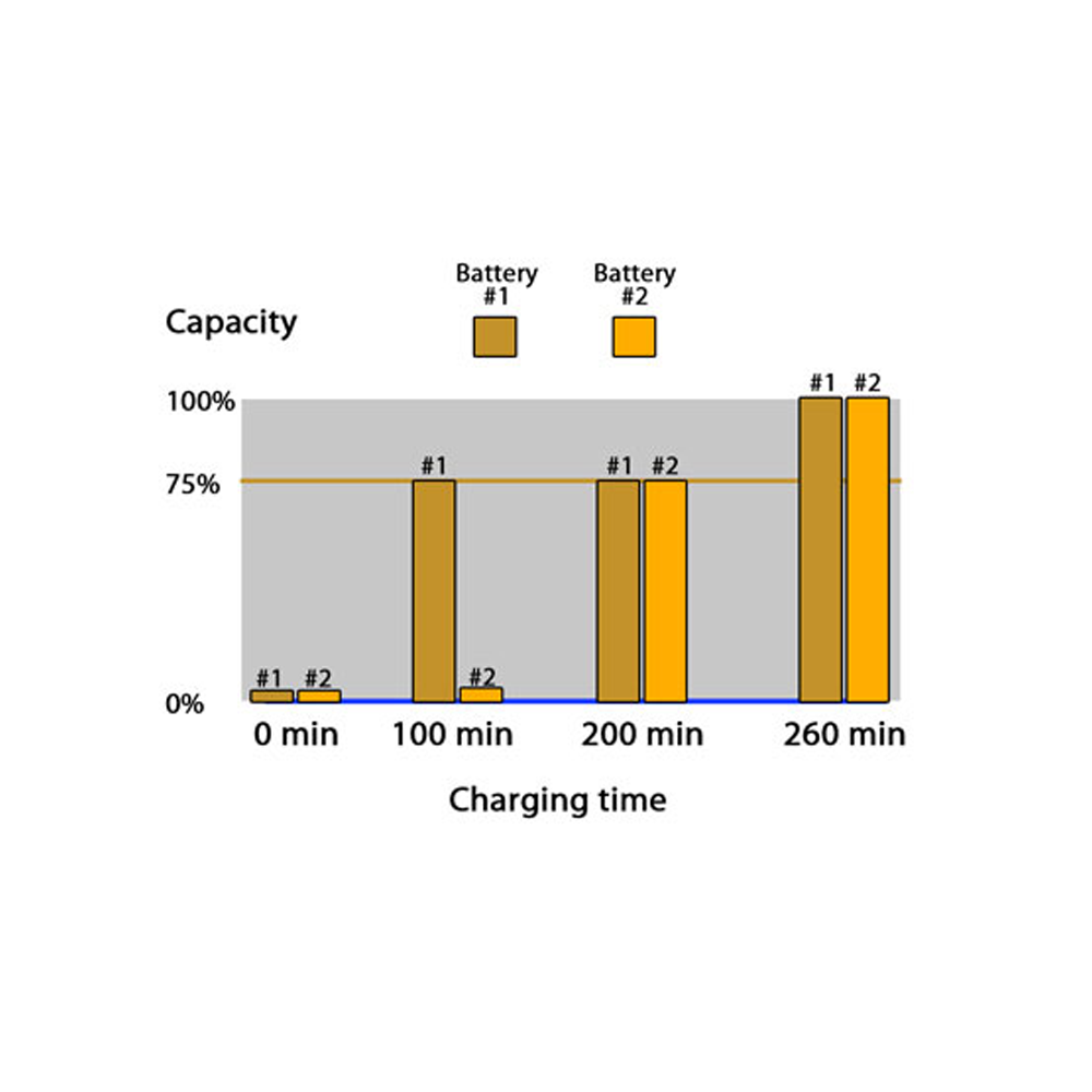 Cada canal cuenta con indicadores LED de carga de 4 niveles que muestran la capacidad en tiempo real en porcentaje durante la carga.