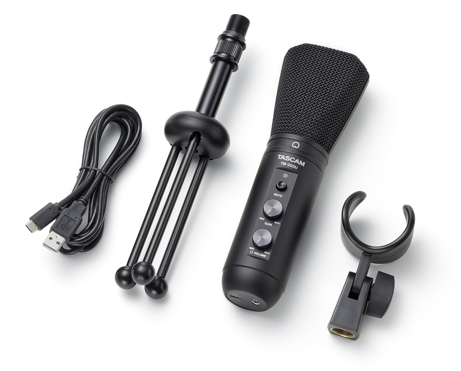 El Tascam TM-250U se suministra con un soporte para micrófono, un cable USB y un soporte de mesa
