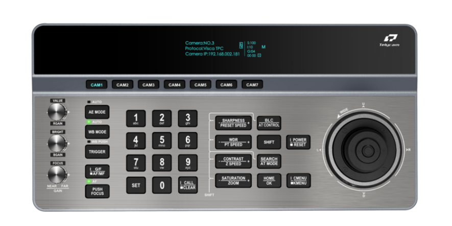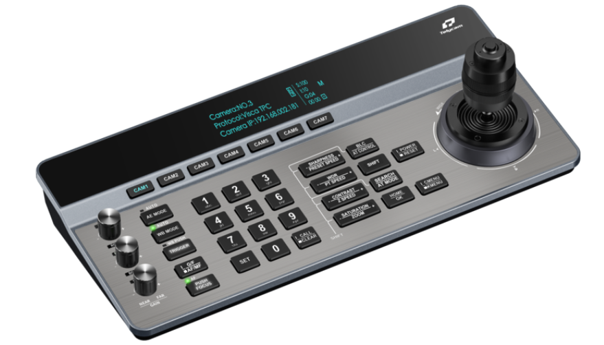 La pantalla OLED integrada de 3,12 pulgadas ofrece información clara en tiempo real sobre el estado de la cámara y los ajustes de control. La disposición ergonómica separa los controles numéricos y funcionales para un manejo intuitivo, mientras que los atajos de teclado permiten cambiar rápidamente entre cámaras. Las opciones de conexión incluyen Ethernet con soporte PoE, interfaces RS232, RS422 y RS485, lo que garantiza la compatibilidad con una amplia gama de cámaras PTZ profesionales.