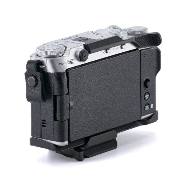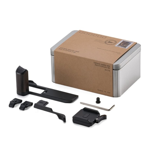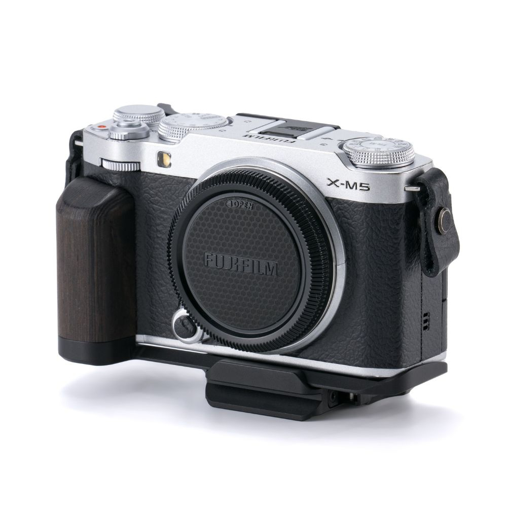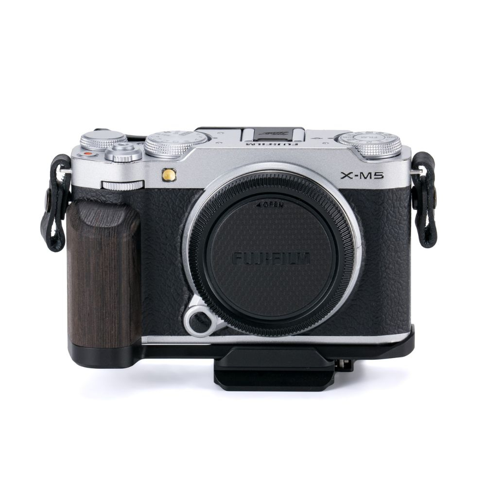 La pieza central del kit es una empuñadura en forma de L con un mango de madera de nogal, que permite un manejo y una sujeción más cómodos de la cámara.