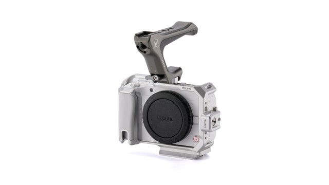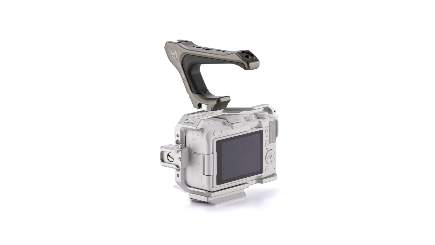 Kit básico de jaula para la Canon R50 V. Esta jaula sirve paraprotegerel cuerpo de tu cámara y, al mismo tiempo, permite acoplar una amplia gama de accesorios externos mediante varias opciones de fijación, entre las que se incluyen un riel, una banda NATO y roscas de 1/4"-20 con puntos de fijación.