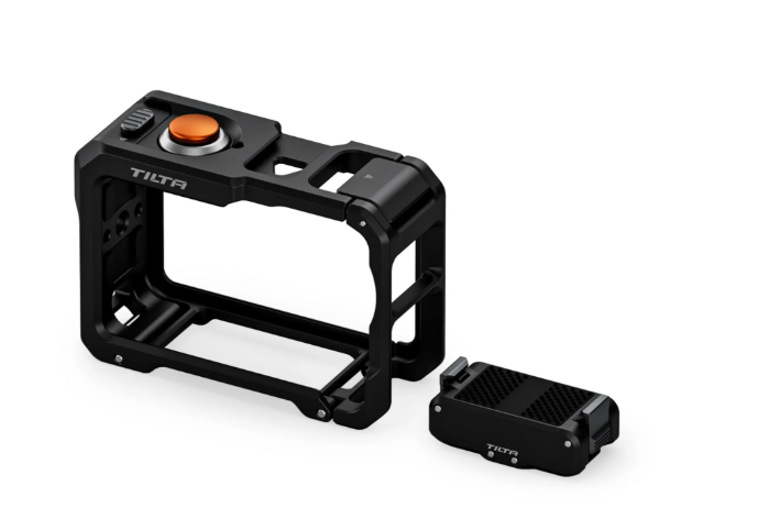 El kit incluye una base magnética que se puede fijar en ambas direcciones y que admite otros accesorios con rosca de 1/4″-20, lo que ofrece flexibilidad para diversas configuraciones de grabación. La parte superior de la jaula cuenta con una extensión ergonómica de los botones para facilitar el acceso a las funciones de encendido y grabación, mientras que la ranura para la tarjeta y la tapa de la batería quedan libres para un cambio rápido.