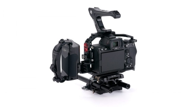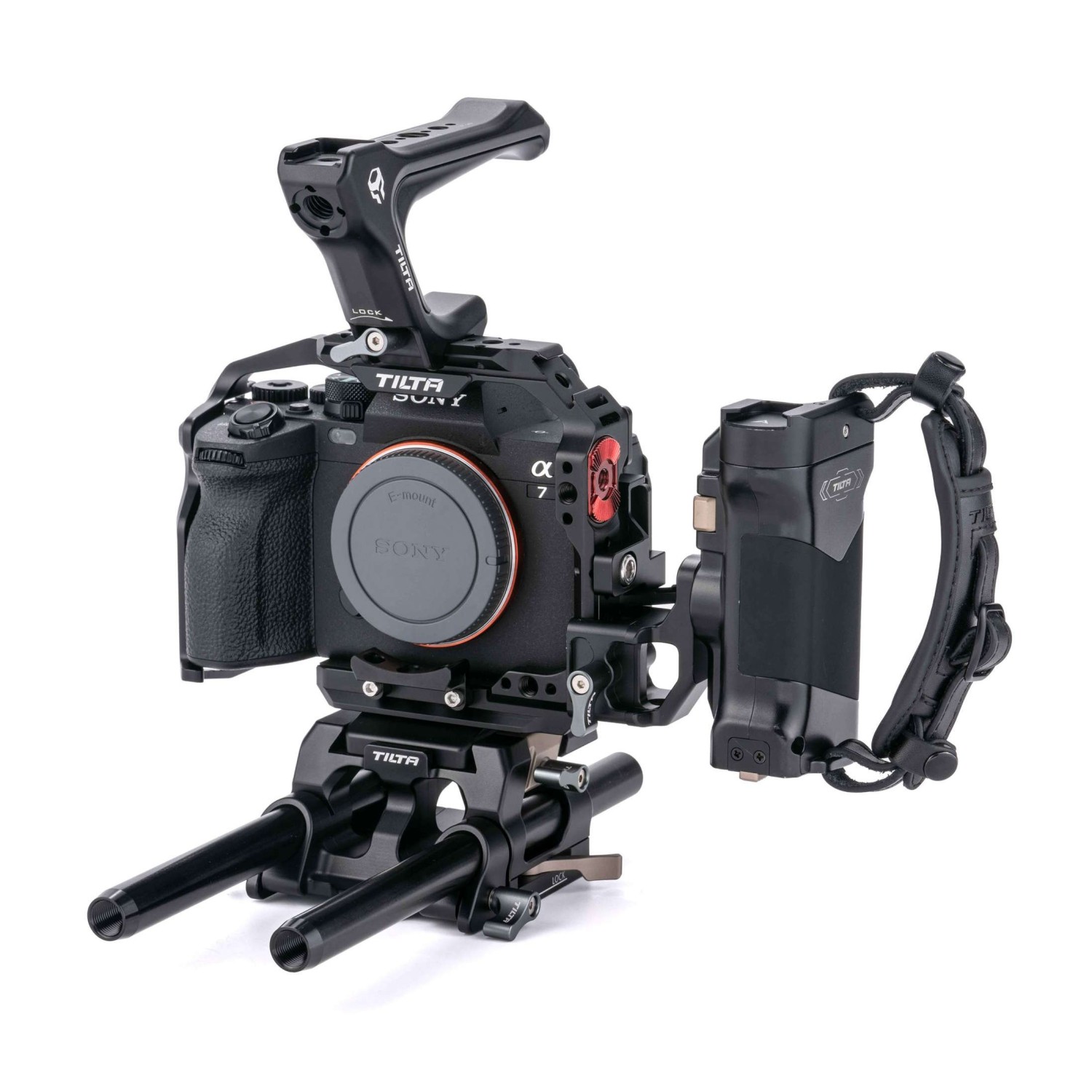 Este kit Pro Kit proporciona una carcasa protectora para las cámaras Sony a7 IV, a1, S3, R4, 73, R3 y A9, e incluye numerosos accesorios que mejoran notablemente la funcionalidad de la cámara. La jaula completa incluye varias roscas de 3/8″-16 y 1/4"-20 con pasadores de posicionamiento, receptores de zapata fría y un riel NATO para empuñaduras laterales de tipo IV y VI.
