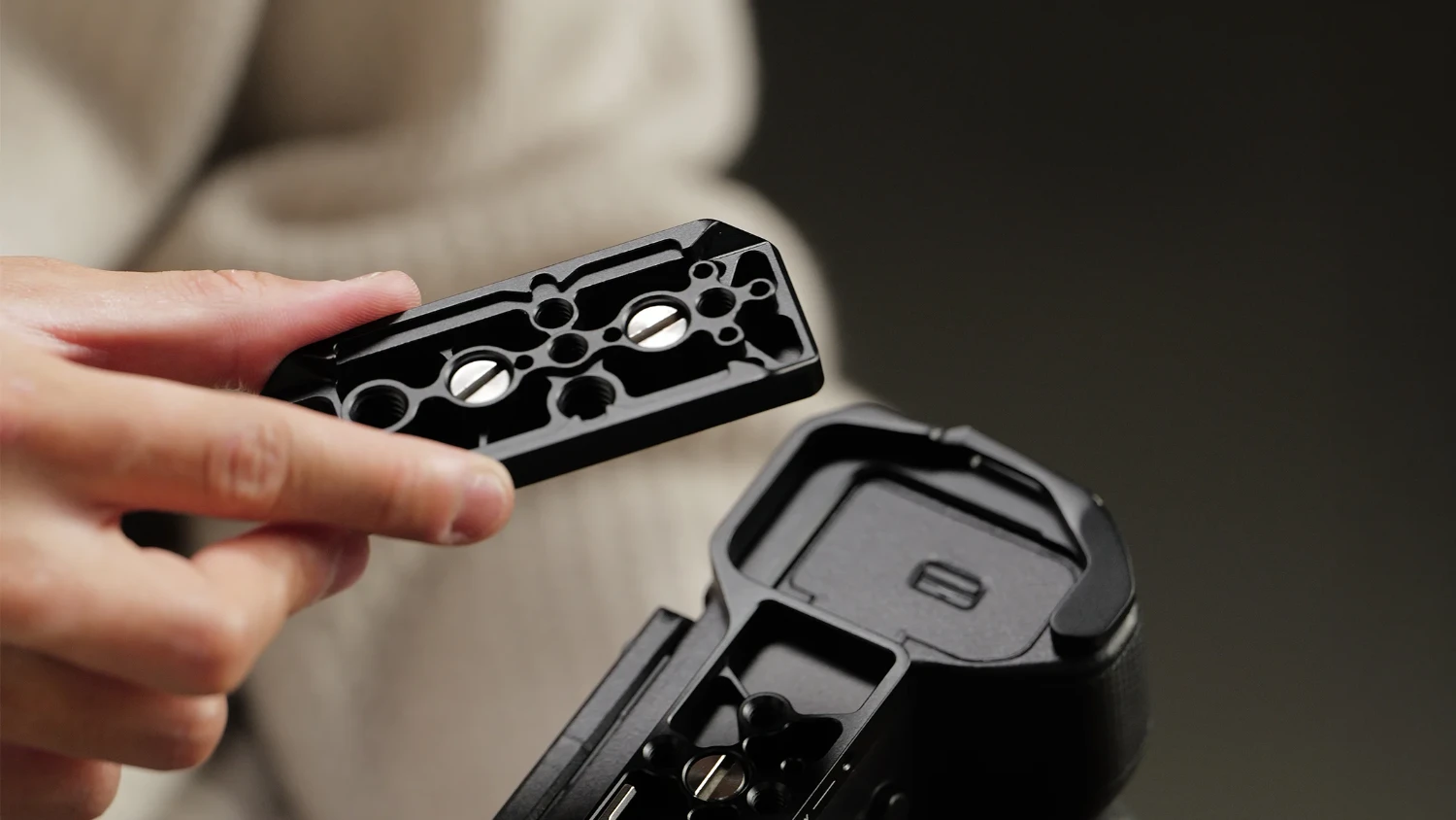 La placa inferior Arca-Swiss bidireccional integrada permite una fijación rápida y un ajuste sencillo de la posición en cardanes y trípodes. La jaula facilita la fotografía vertical, ya que permite fijar empuñaduras mediante las roscas integradas de 1/4”-20.