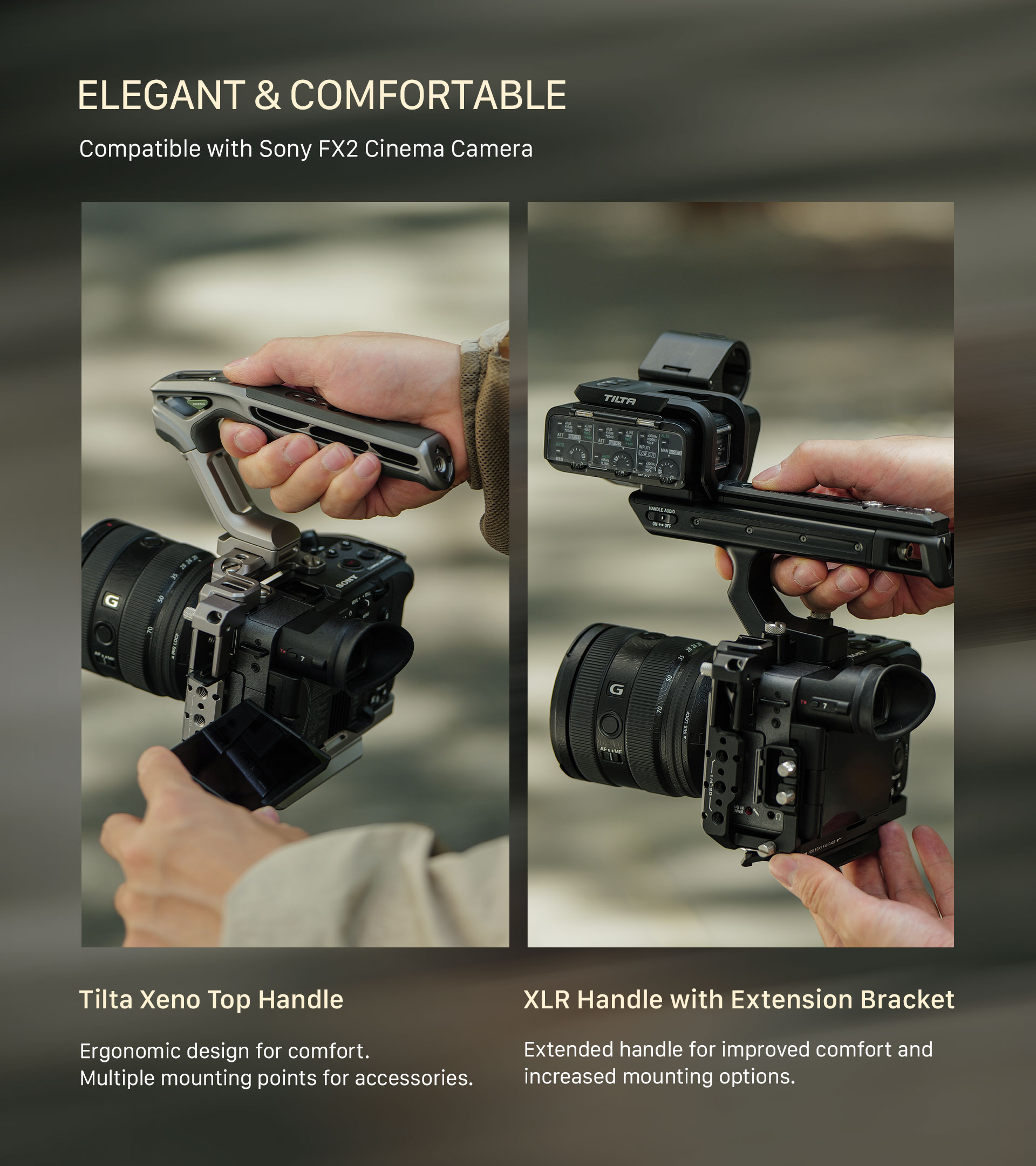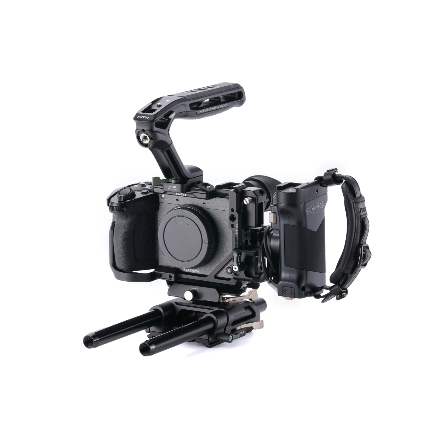 El paquete también incluye una empuñadura de alimentación avanzada que se conecta a la jaula mediante un raíl NATO, alimenta los accesorios y permite controlar el inicio y la parada mediante el cable incluido. La rotación ajustable y la correa de mano adicional proporcionan una comodidad y flexibilidad excepcionales al manejar la Sony FX2.