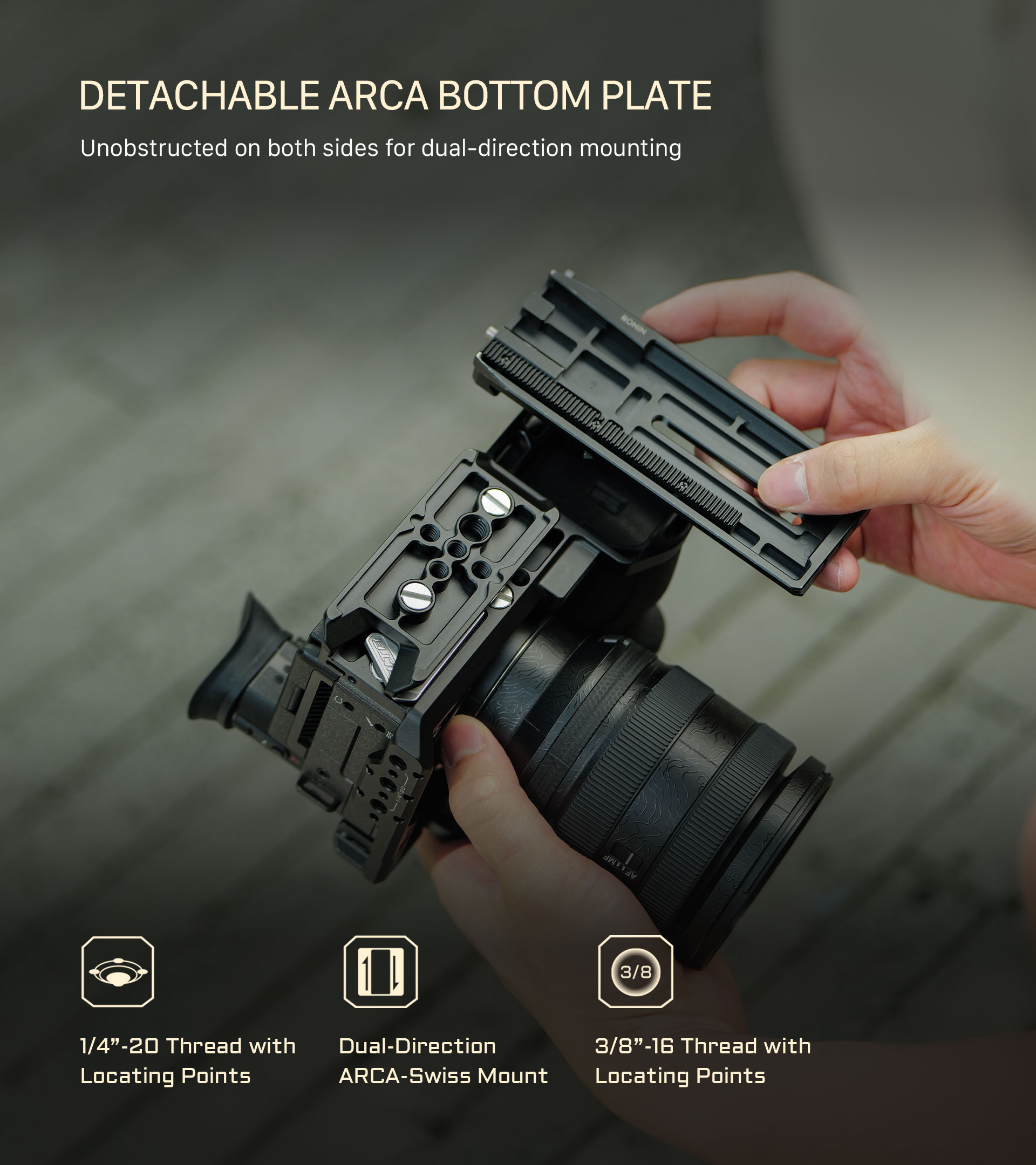 La nueva placa inferior ARCA bidireccional es ideal para cambiar rápidamente entre el trípode y los gimbals DJI. Esta placa ahora es extraíble, lo que permite a los usuarios retirarla rápidamente y montarla en el lateral de la jaula para pasar fácilmente a una configuración vertical. Ten en cuenta que esta jaula utiliza el estándar ARCA de DJI. No se garantiza la compatibilidad con otros estándares.