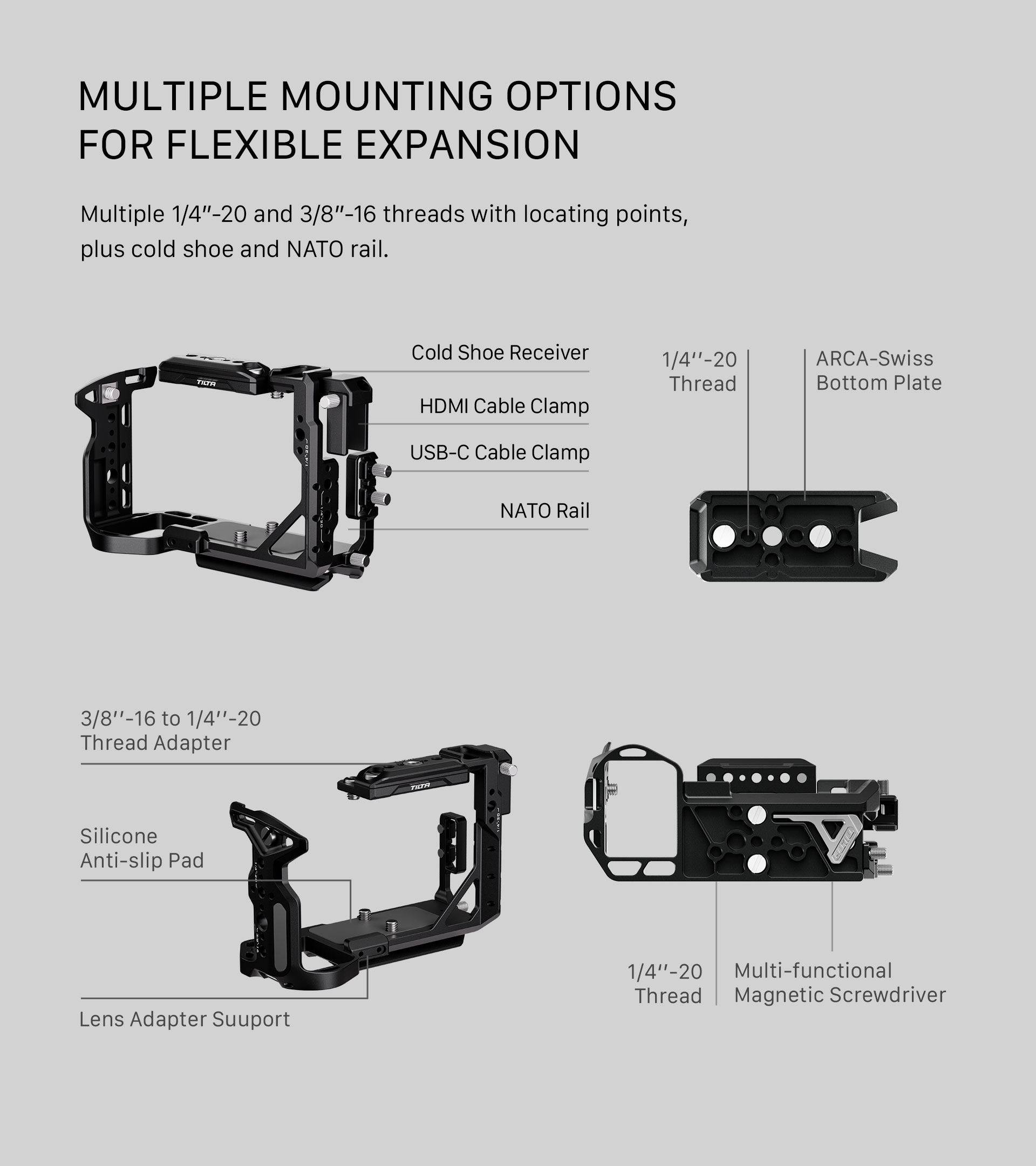Esta jaula para cámara admite diversos accesorios a través de puntos de montaje, como roscas de 1/4”-20 y 3/8″-16 con diferentes puntos de posicionamiento, un receptor de pie frío, rieles NATO y puntos de montaje para un soporte de barra única.