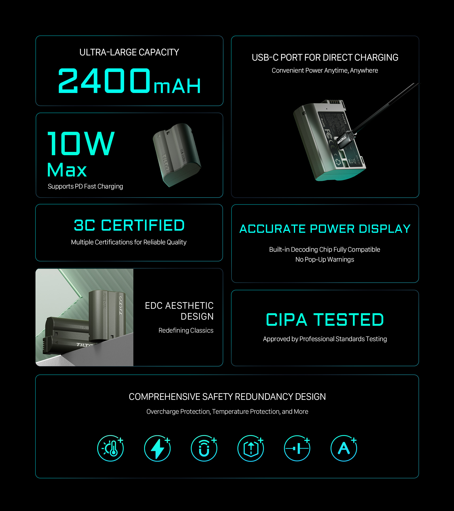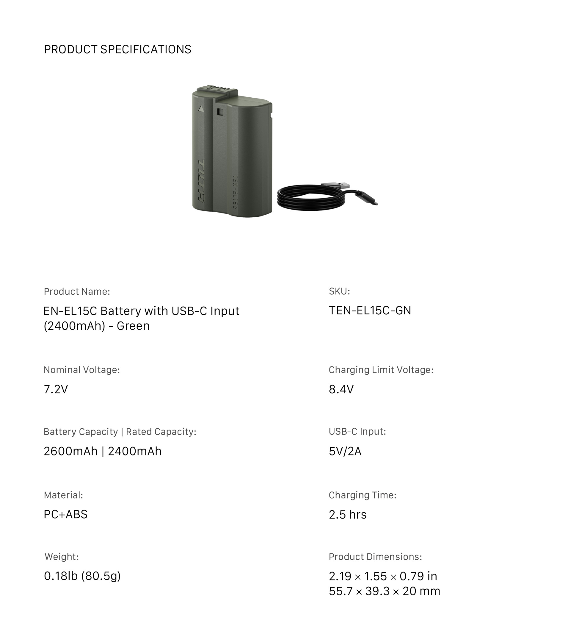 Tanto si eres un profesional como un aficionado, la EN-EL15C es una solución de alimentación inteligente, eficaz y segura para todas tus necesidades fotográficas y de vídeo.