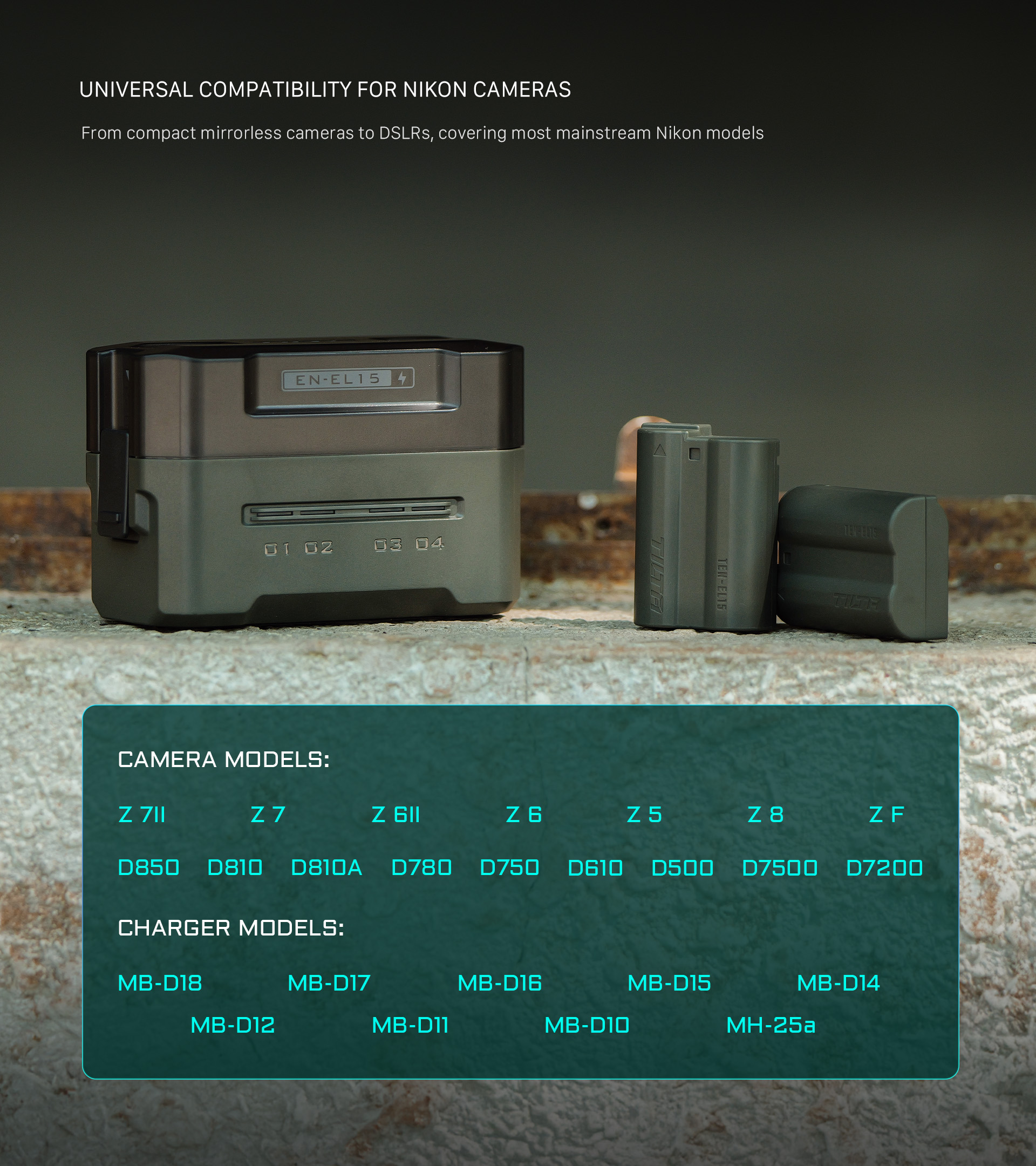 • DISEÑO UNIVERSAL Compatible con cualquier cámara o accesorio que admita la batería EN-EL15C