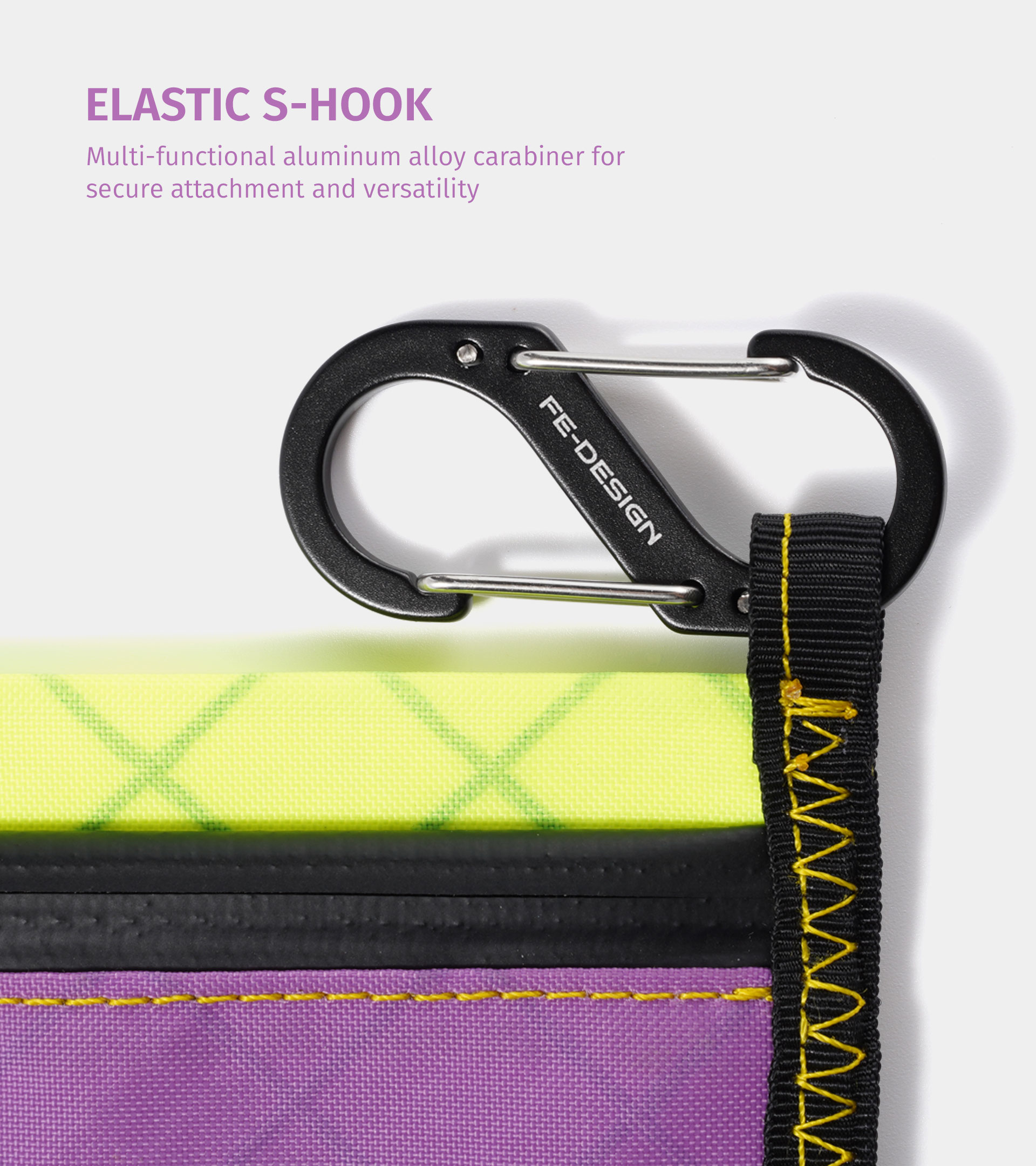 Cada detalle del portacartas Fé está cuidadosamente pensado. El gancho elástico en forma de S es un mosquetón universal de aleación de aluminio para fijarlo de forma segura a bolsos, cinturones o equipamiento.