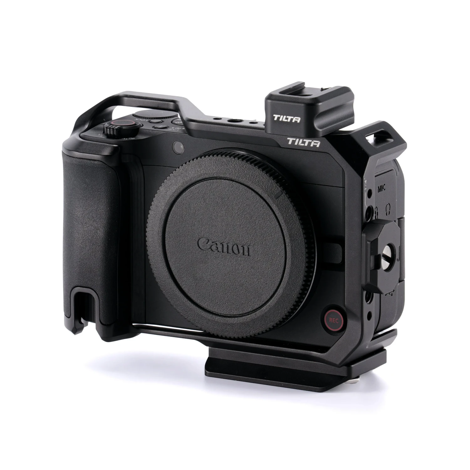 Presentamos el marco completo para la Canon R50 V. Este marco sirve como una capa adicional de protección para el cuerpo de tu cámara y, al mismo tiempo, permite conectar una amplia gama de accesorios externos mediante varias opciones de montaje, incluyendo una zapata fría, una barra NATO y roscas de ¼”-20 con puntos de fijación.