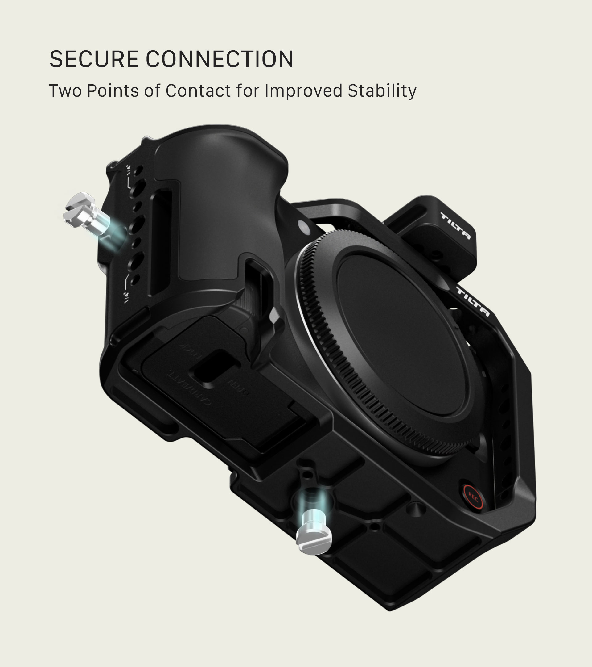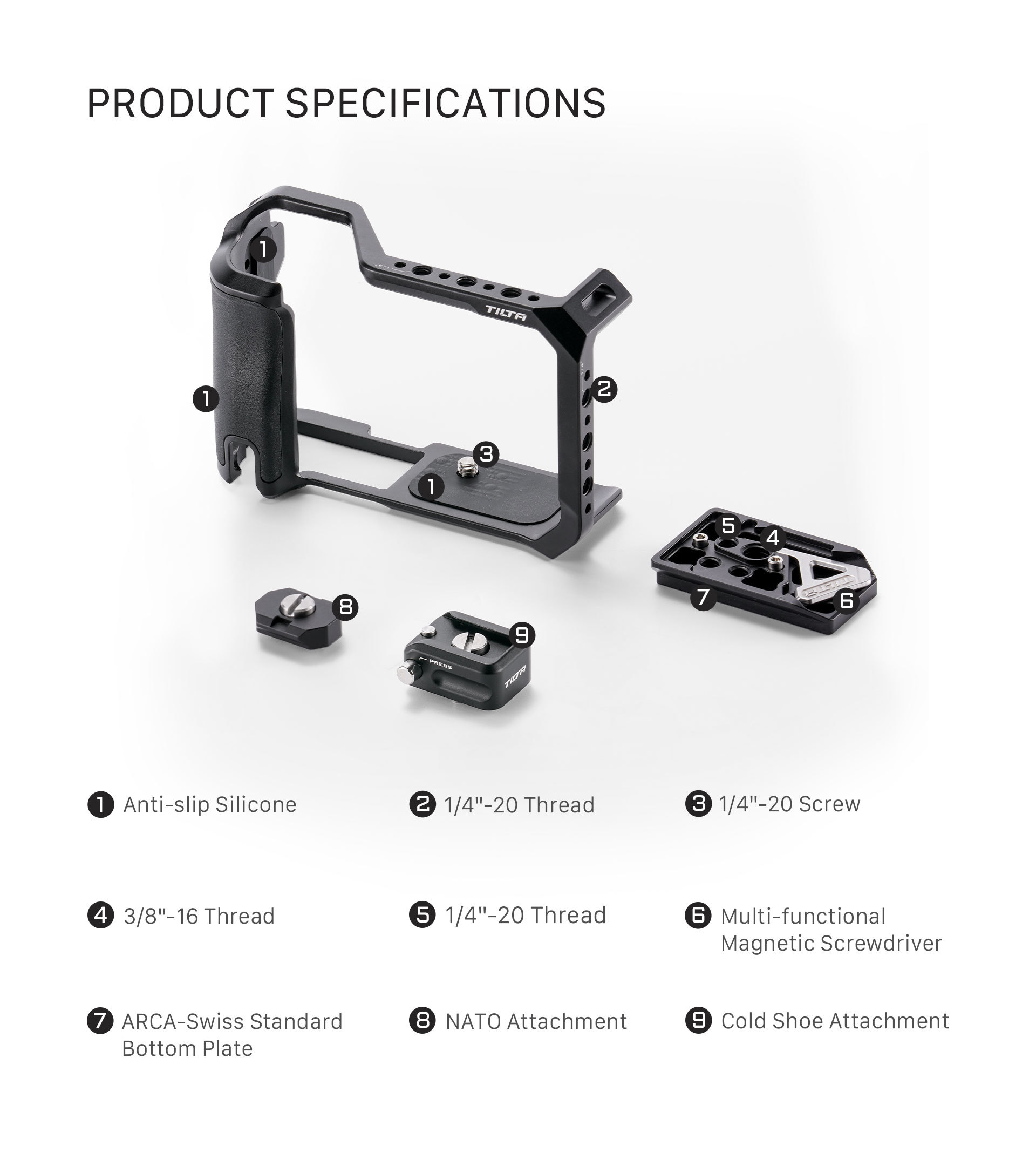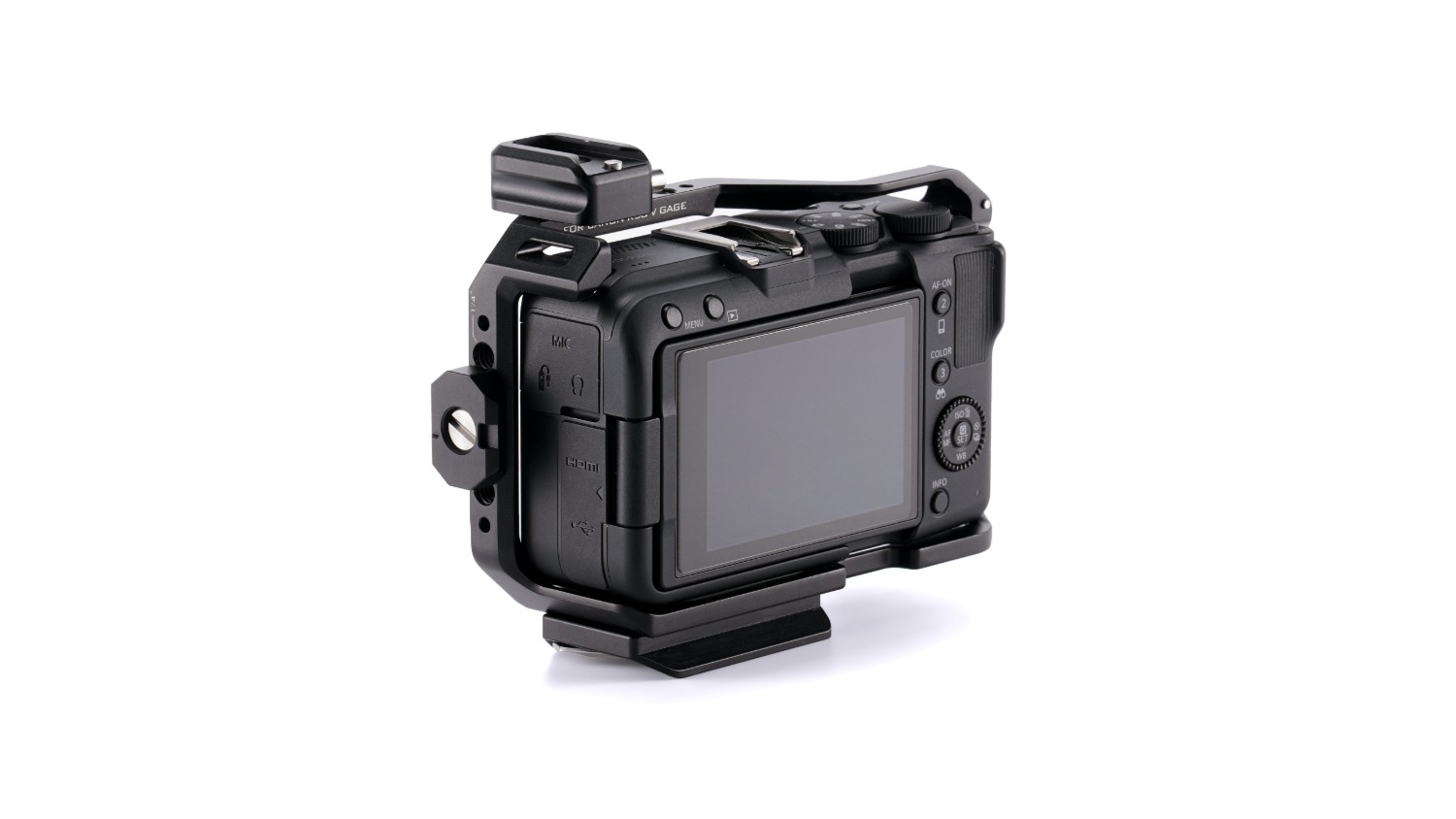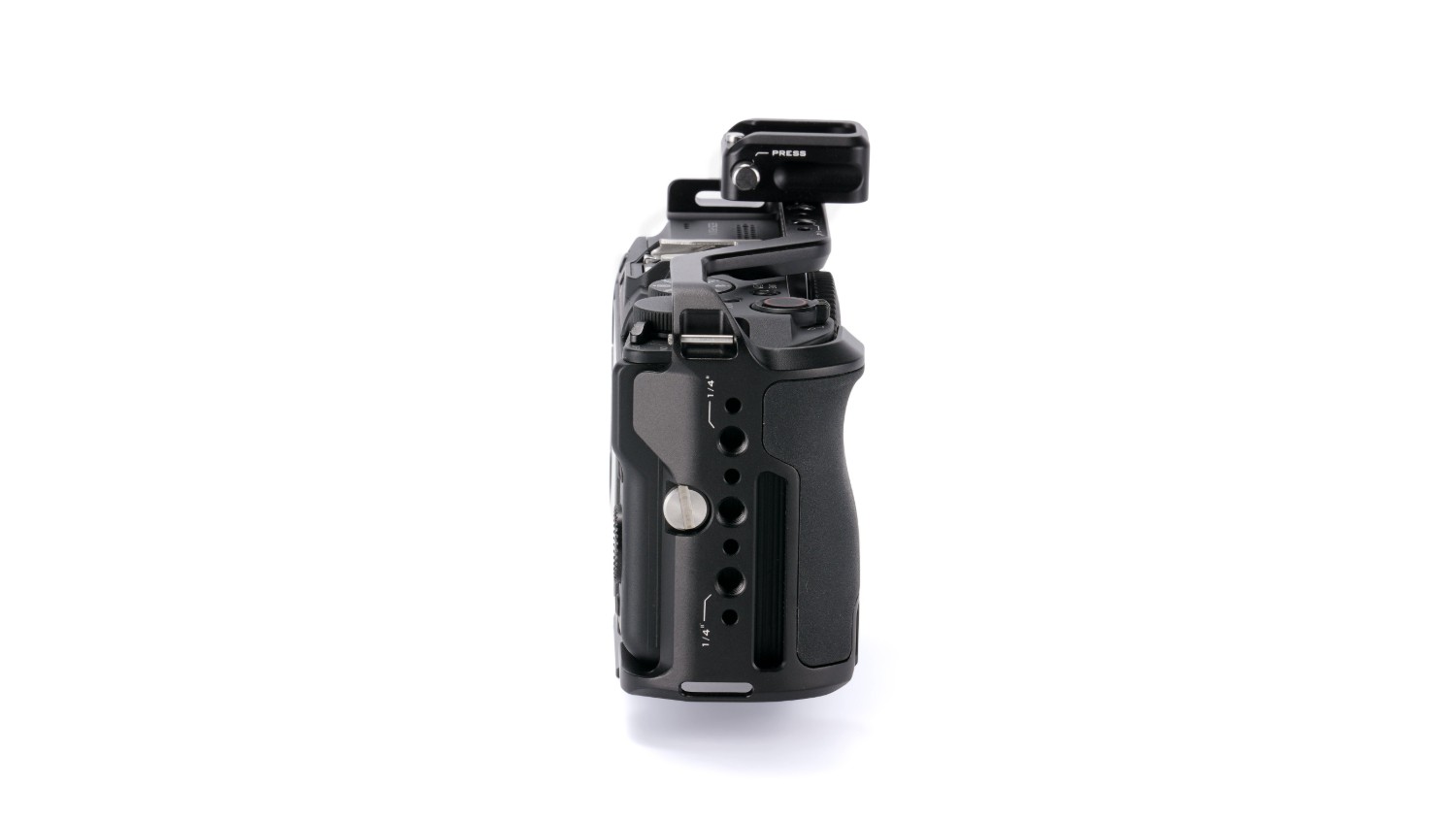 Este marco para cámara sirve como una capa adicional de protección para el cuerpo de la cámara y, al mismo tiempo, permite acoplar una amplia gama de accesorios externos mediante varias opciones de montaje, incluyendo un soporte Cold Shoe, un raíl NATO y roscas de ¼”-20 con puntos de fijación.