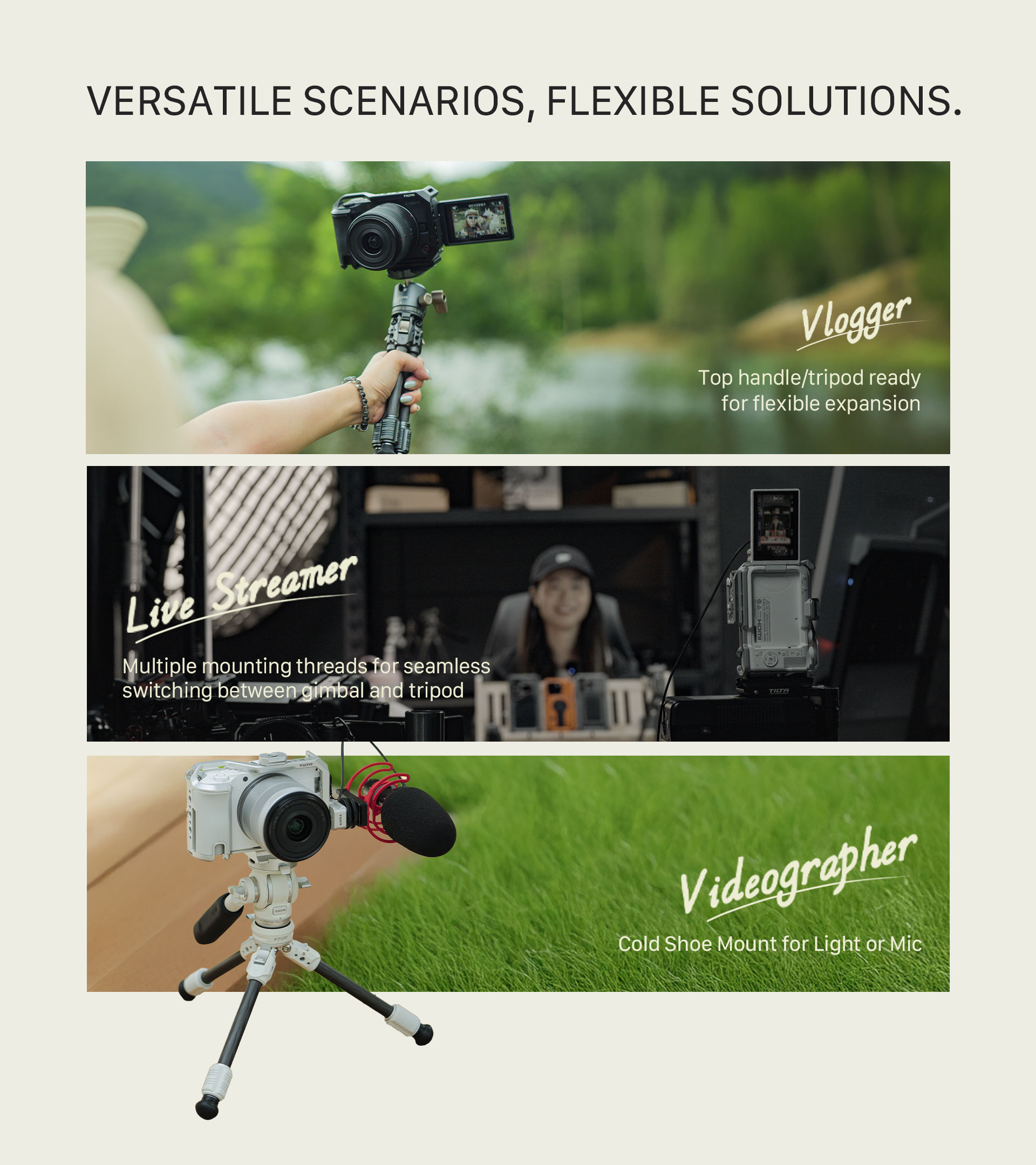 Hemos incluido un asa integrada con agarre de silicona que se adapta perfectamente a la curva de la palma de la mano, lo que hace que su uso a mano alzada sea más cómodo que con las jaulas tradicionales para cámaras.